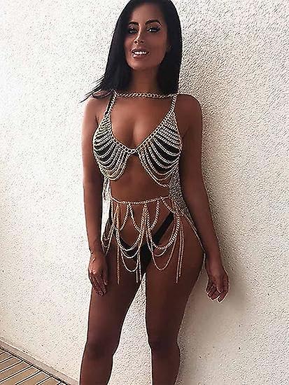 Size: Top: Neck 44cm, Waist 83cm, Extension Chain 15cm Bottom: Waist 73cm, extended chain 15cm Material: Alloy Weight: 220g Sexy body chain bra made of high quality durable hard alloy.Sturdy and shiny for everyday wear. Bohemia layered bikini body chain design for women and girls.It can highlight your perfect body,make you more confident and charming.Adjustable body chain design, making it suitable for most women to wear.Wearing Occasion: Engagement / Proposal / Party / Gift / Daily. Suit for belly dance, parties, clubwear,anniversaries, graduations, birthdays,and other performance. The unique chain perfect for matching your dress, blouse, long shirt, bikini suit. We are committed to providing high quality fashion jewelry and the best customer service, if there are any problems with the purchase please don't hesitate to contact us,we will help to solve the problem.