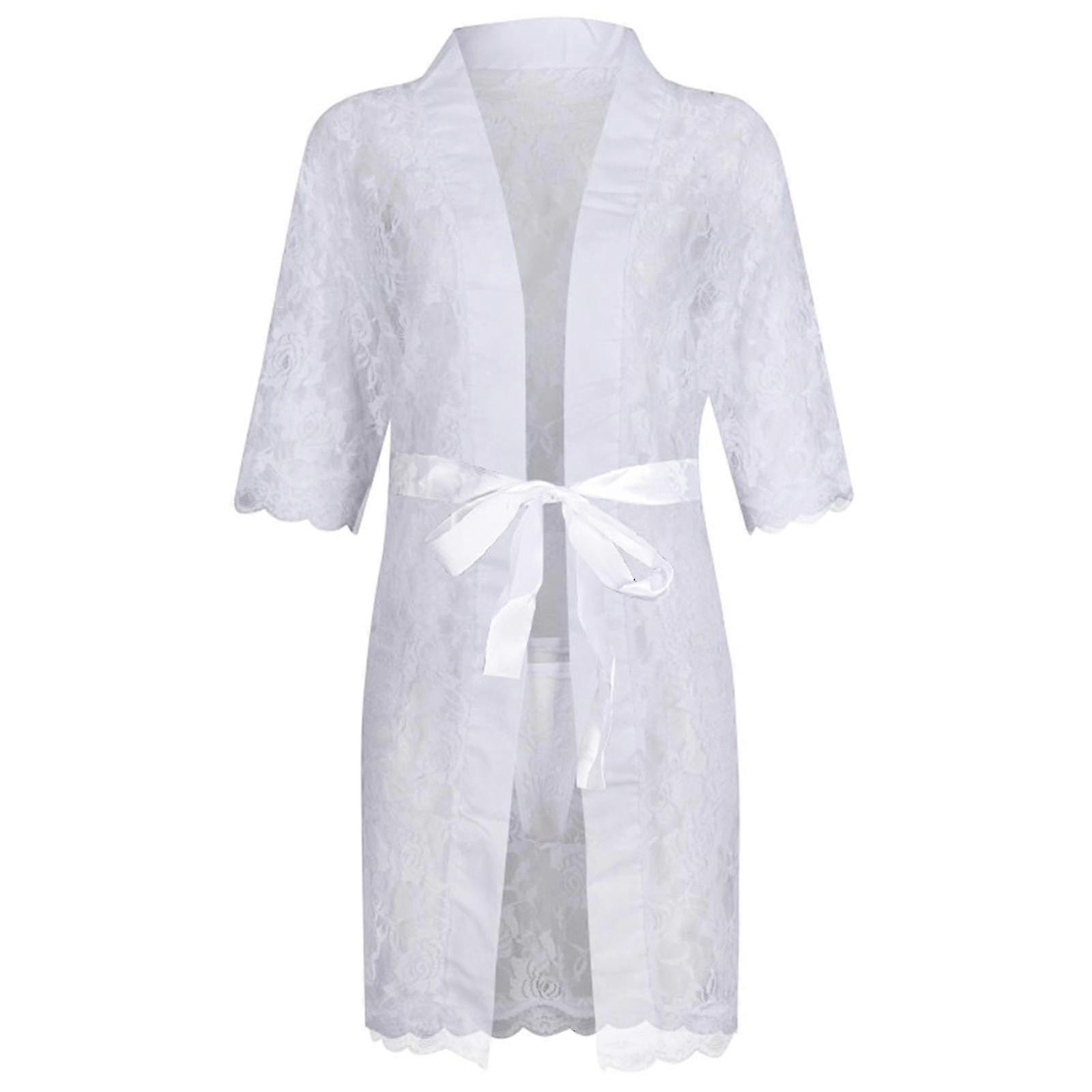 2025 Men's Floral Lace Bathrobe Mesh Lingerie Transparent Belted Sleepwear Pajamas Suit Nightgown Robe with G-String Thong White L