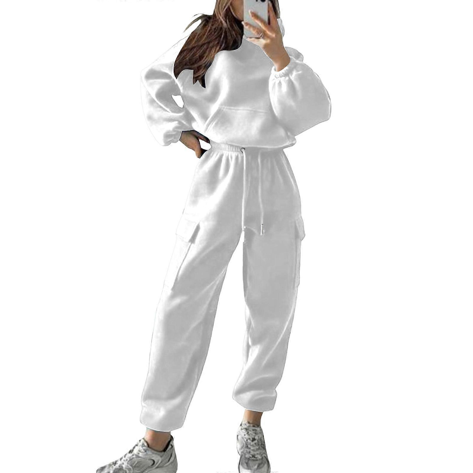 Women Sweatsuits 2 Piece Suit Sweatshirt and Wild Leg Sweatpants Sweatsuit With Pockets White XL