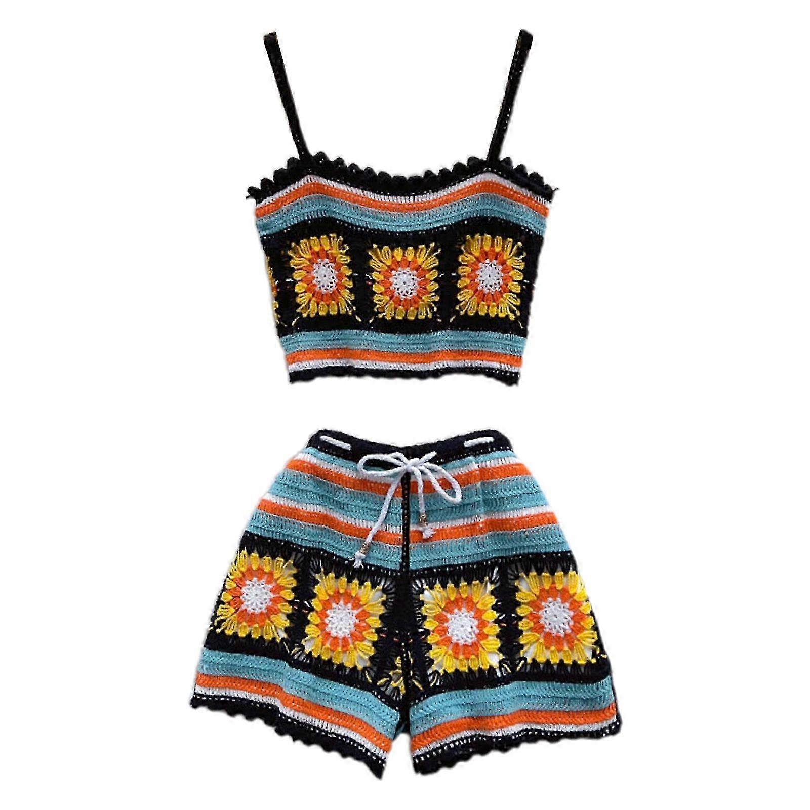 2025 Women's Two Pieces Suits Ethnic Style for Tank Tops and Shorts High Waist Shorts Crocheted Patchwork Crop Tops for Vacat Black Average code