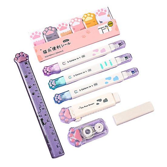 The set includes 1 retractable eraser, 1 spare eraser, 1 correction tape, 1 ruler, 1 plastic storage box, 3 double-sided highlighters, and 120 sticky memos - everything you need for your daily tasks. The cute cat-themed design will leave you in a good mood while studying or working, adding a touch of fun to your day.