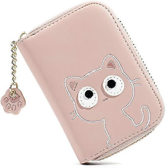 Cute Little Cat Pattern Card Holder- Accordion Zipper Card Case Cash Pockets Coin Purse Zip Around Wallet with Paw Pendant (PINK)