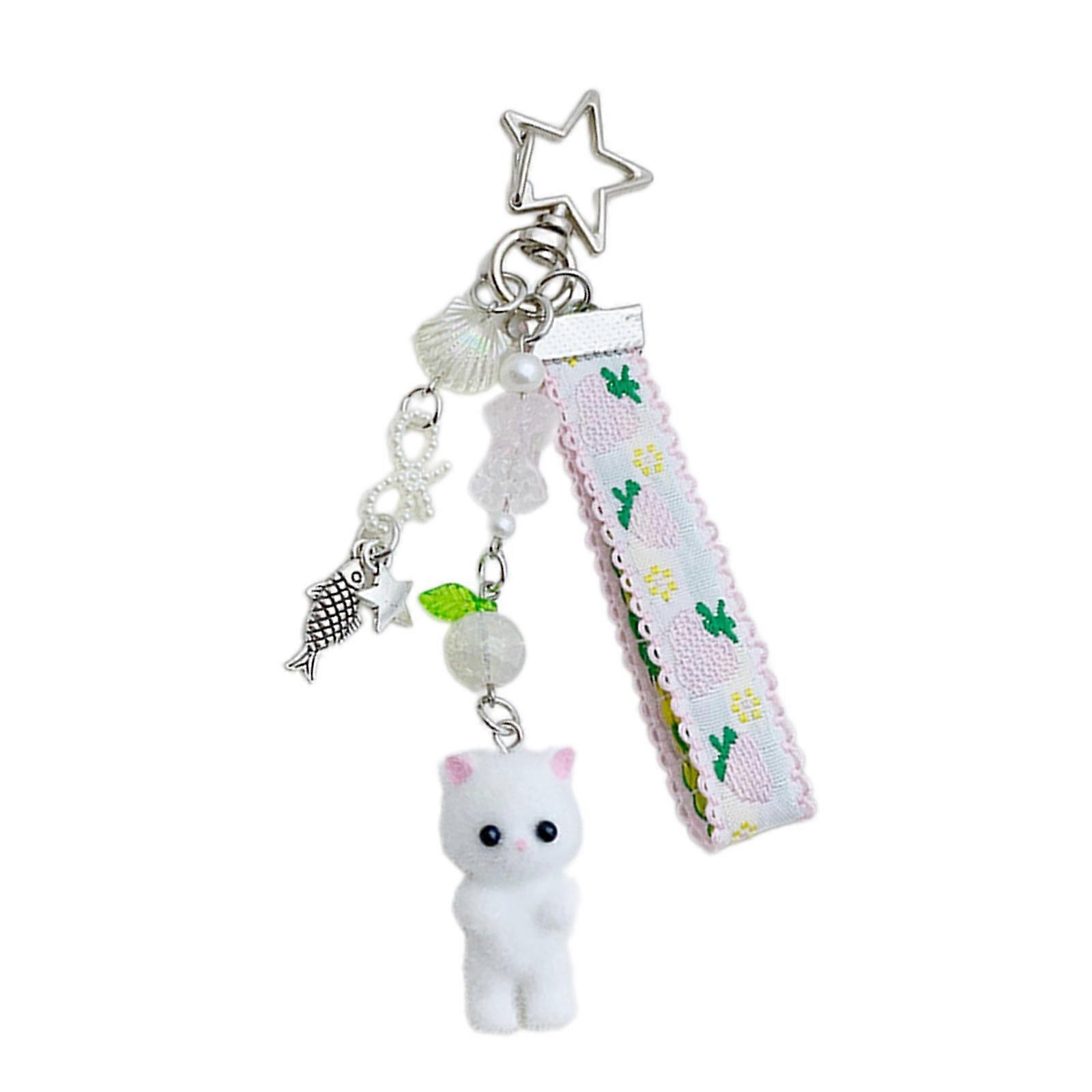 Cute Flocking Cat Fish Bead Keychain Pendant Lovely Hanging Decorations Keyring Charm for Purse Bag Backpack Handbag White