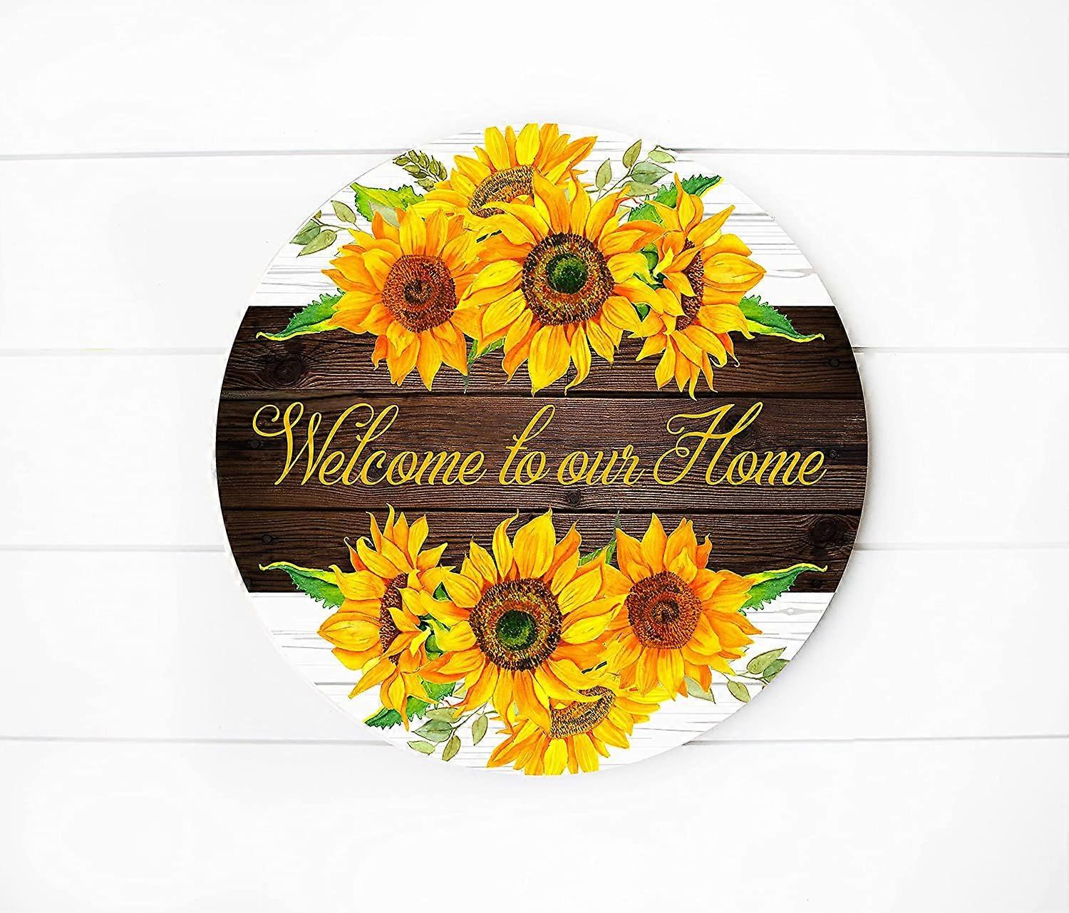 Sunflower Welcome to Our Home Printed Handmade Round Wood Sign (8 inch with sawtooth hanger)
