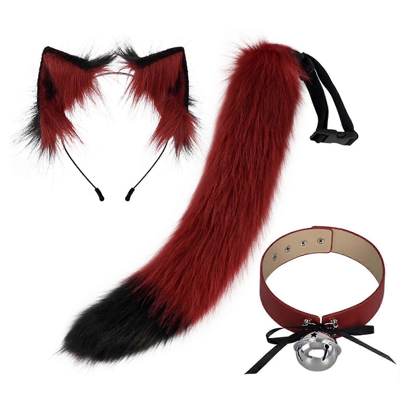 Cat Ears and Tail Choker Furry Cat Ear Headband with Tail Halloween Cosplay Party Cat Costume Accessories for Kids Adult Reddish black