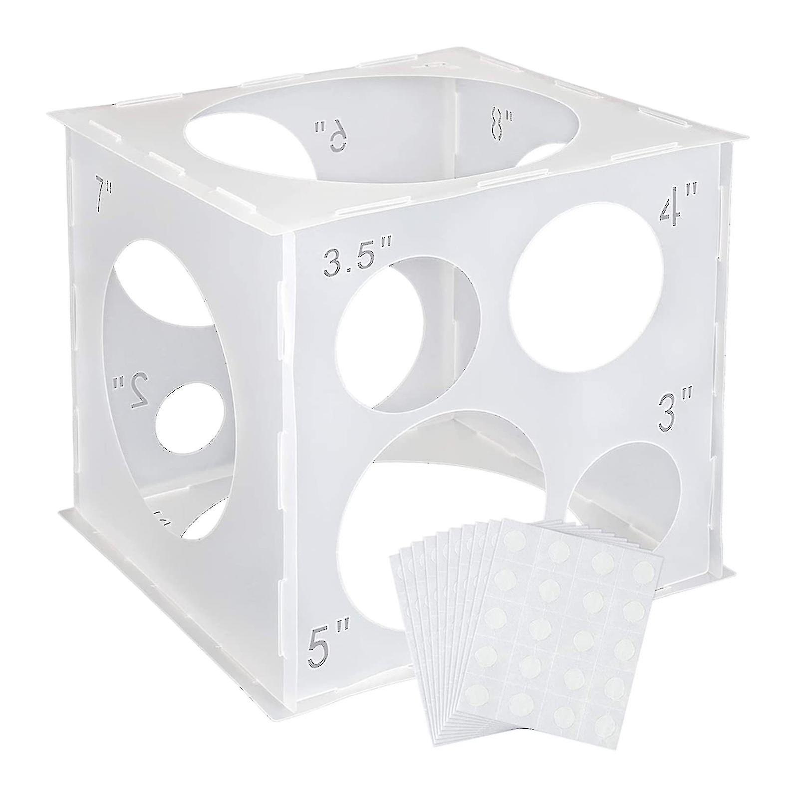 Measuring ToolBalloon size box is a practical tool for quickly measuring the size of the balloon translucent white easy to observe the state of the balloon easy to operate.Durable MaterialThe balloon sizer box is made of eco-friendly PP plastic material durable and sturdy lightweight not easy to break smooth surface and edges will not hurt the balloons and your hands.11 Different SizesThe balloon sizer cube box is designed ith with 11 holes sizes 3inch 3.5inch 4inch 5inch 2inch 4.5inch 6inch 7inch 8inch 9inch 10inch meet you different measurement needs.Easy AssembleThe balloon size box has six sides and it is a cuboid after being assembled successfully easy to assemble and disassemble easy to carry easy to store when not in use.Various OccasionsBalloon measuring tool is useful for making balloon background decoration balloon arch decoration great for wedding birthday party festivals celebrations and more occasions.Assembly steps:1.Splicing the 5inch side with the 7inchside.2. Splicing the 9inch side with the 5inch and 7inchsides.3. Splicing the 6inch side with the 7inch and 9inch sides.4.Splicing 8inch and 9inch then splicing 5inch and 6inch together.5. 10inchsides are stitched together with 5inch 7inch 8inch 6inch sides.Specification:Material: PPColor: Translucent WhiteSize(LxWxH): About 30x23x28cm/11.81x9.06x11.02inchPackage includes:1pc x Balloon Sizer BoxNote:1. Due to the light and screen difference the item&