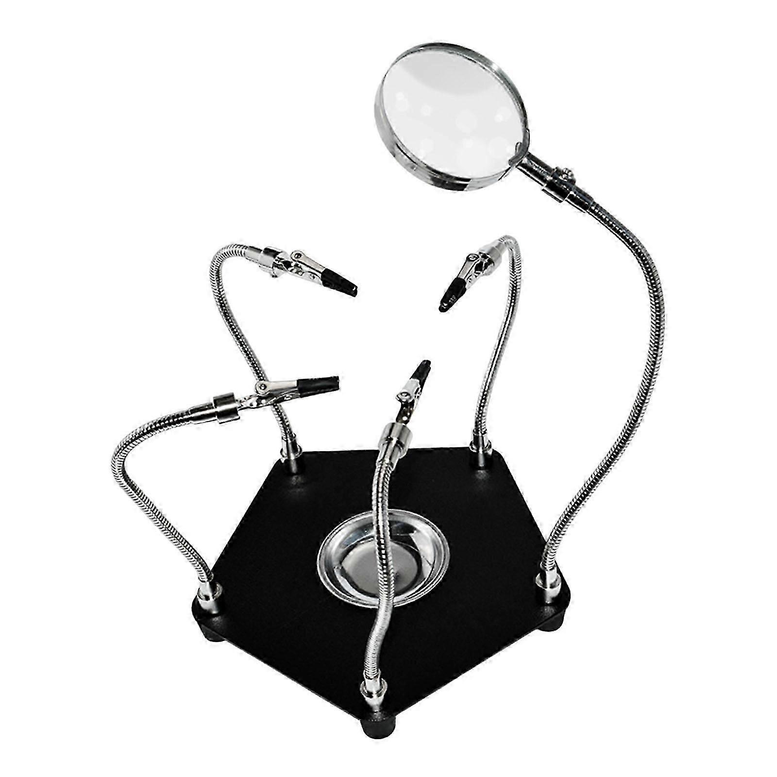 Description: Heavy Metal Base: The Helping Hands Soldering Station is easy to clean, and black base is designed to withstand long term use.Four Strong Arms: Each arm of Third Hand Soldering Tool features a 360 degree precision alligator clip that holds your work in place, freeing up your hands for other tasks.Movable Base Arm: The four base arms of PCB Holder with Soldering Stand can be moved according to the size of the PCB board, making it an flexible auxiliary tool for PCB welding. Rubber Protection and Support Feet: Circuit Board Holder with Flexible Arms, each clamp comes with rubber protection to prevent short circuiting or damage from sharp clamps. The rubber support feet ensure stability and prevent slipping or sliding.Versatile Use: This PCB Repair stand is ideal for various DIY projects such as amateur hobby projects, electronic welding repairs, arts and crafts, painting sculptures and models etc. Specification: Product Name: PCB Welding Repair StandMaterial: Metal/Acrylic Optical LensLens Magnification: 3xMirror Size: 62mm/2.44 inchesWorkbench Size: 108mm/4.25 inches Package Includes: 1 Helping Hands Soldering Station Note: Please allow slightly errors 1-2cm differences due to manual measurement.Due to differences between monitors, the image may not reflect the actual color of the product.