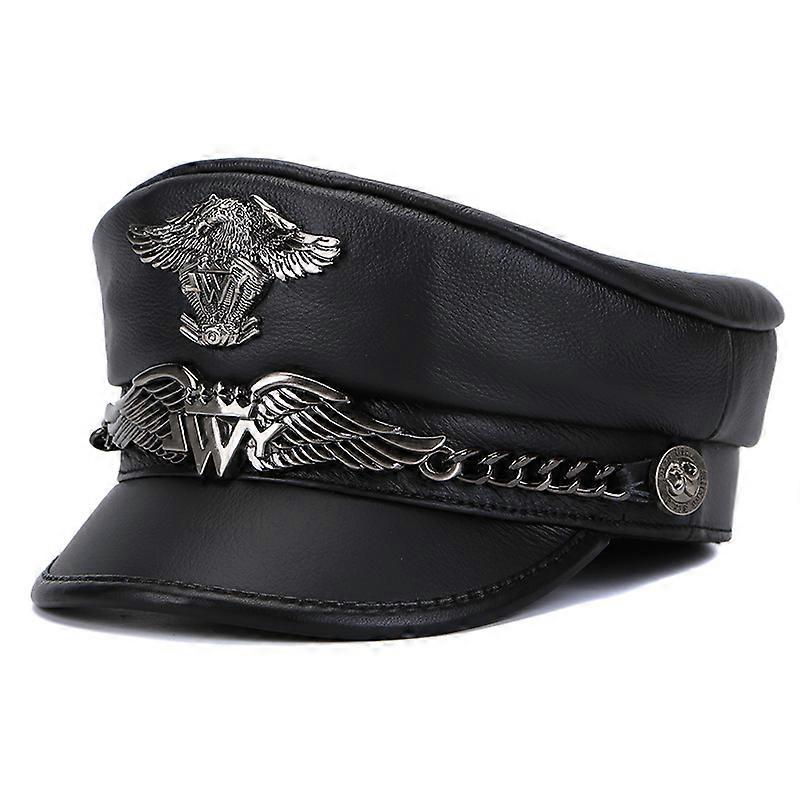 Unisex German Military Cap Man Genuine Leather Flat Top Hat Korean Fashion Eagle Mark Chain Punk Locomotive Casquette Male 50