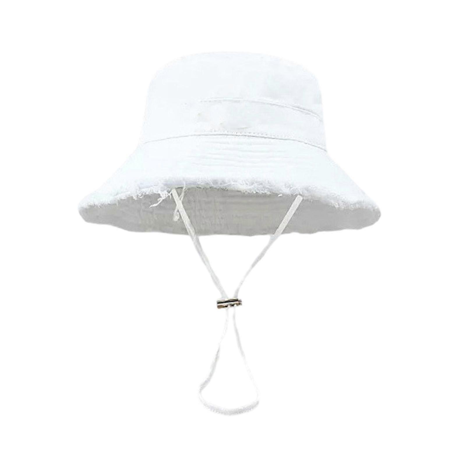 Unisex Frayed Edge Design Bucket Hat Summer Foldable Fisherman Hat with Adjustable Chin Rope Hat for Friend Family White