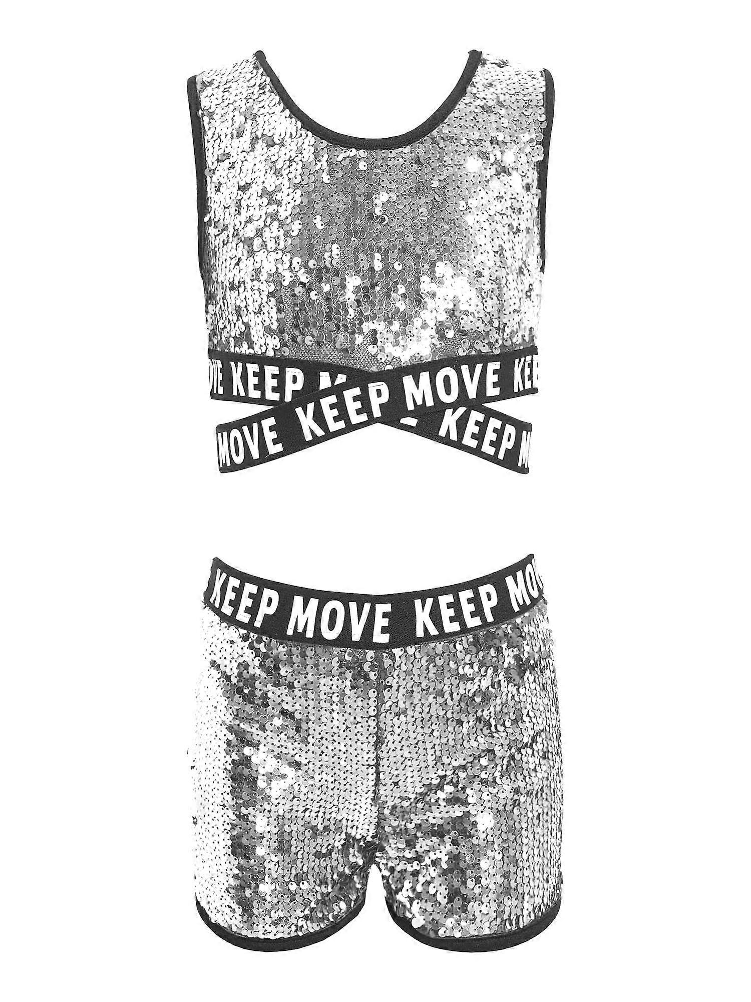 Kids Girls Sparkling Sequins Dance Clothes Set Fashion Wear Sleeveless Round Neck Criss Cross Straps Bottom Crop Top with Shorts