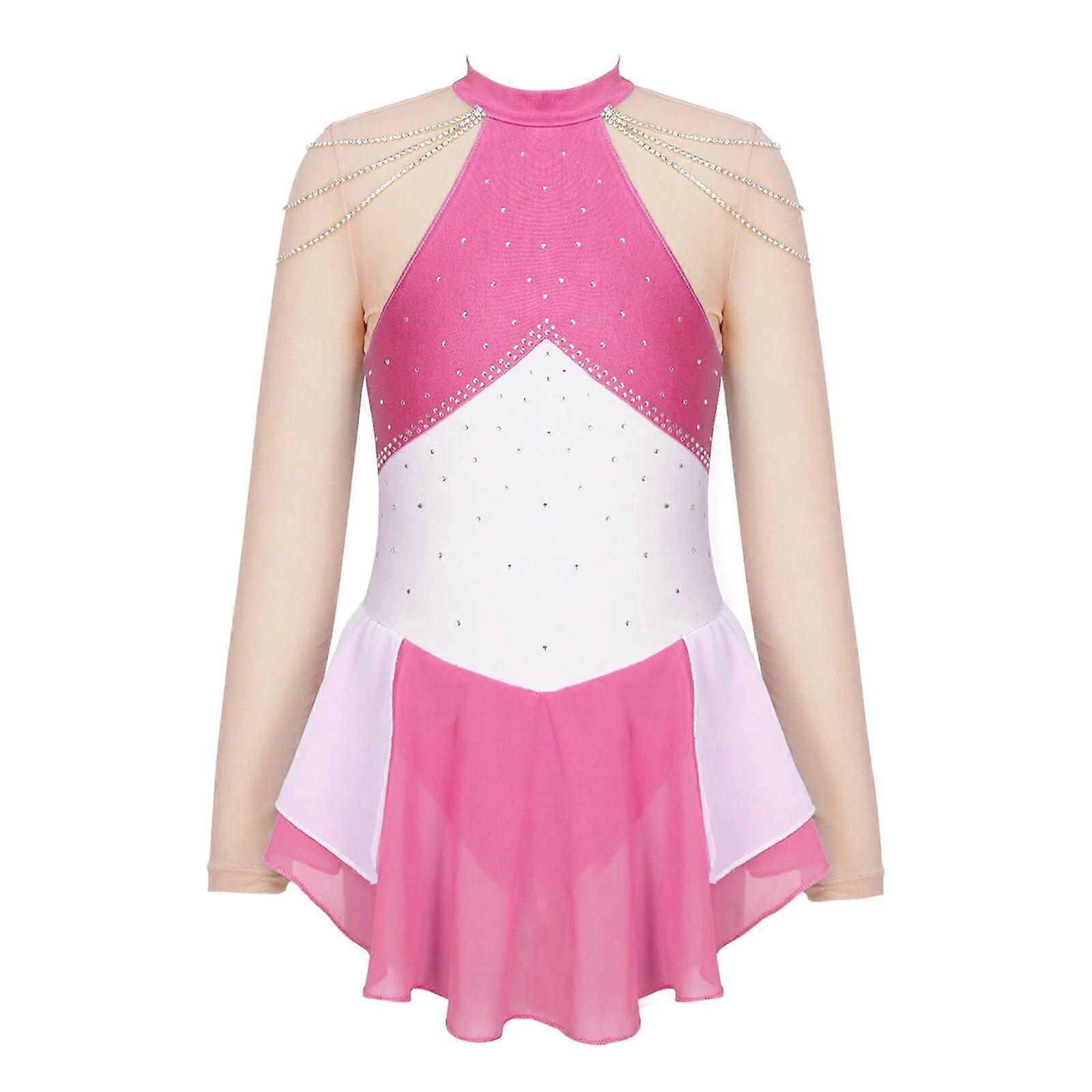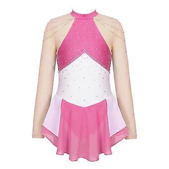 Kids Girls Long Sleeve Patchwork Ballet Gymnastics Leotard Rhinestone Children Figure Skating Dress for Dancing Competition