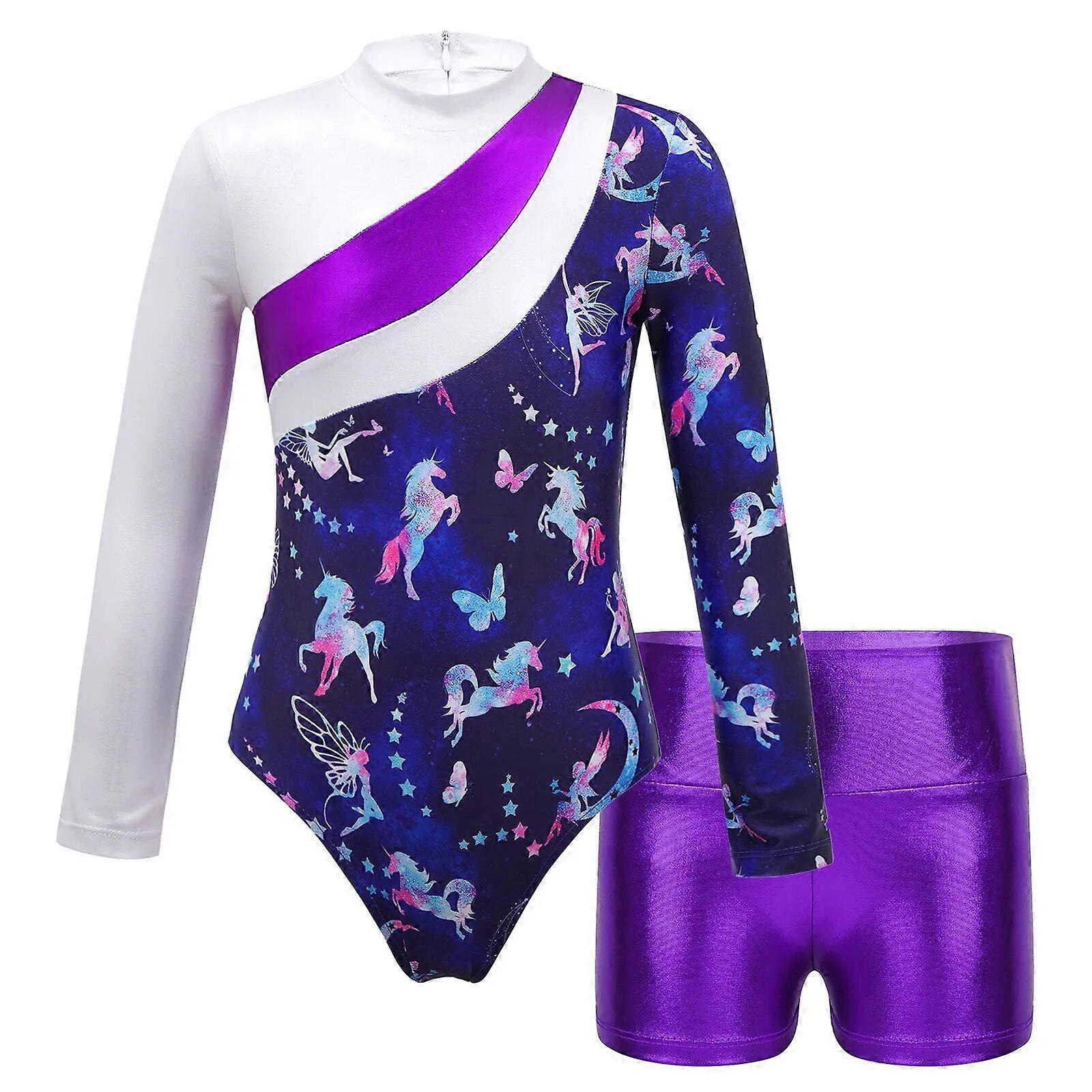 Kids Girls Ballet Outfit Childs Long Sleeve Printed Dance Leotard with Shorts Children Gymnastics Jumpsuit Performance Dancewear