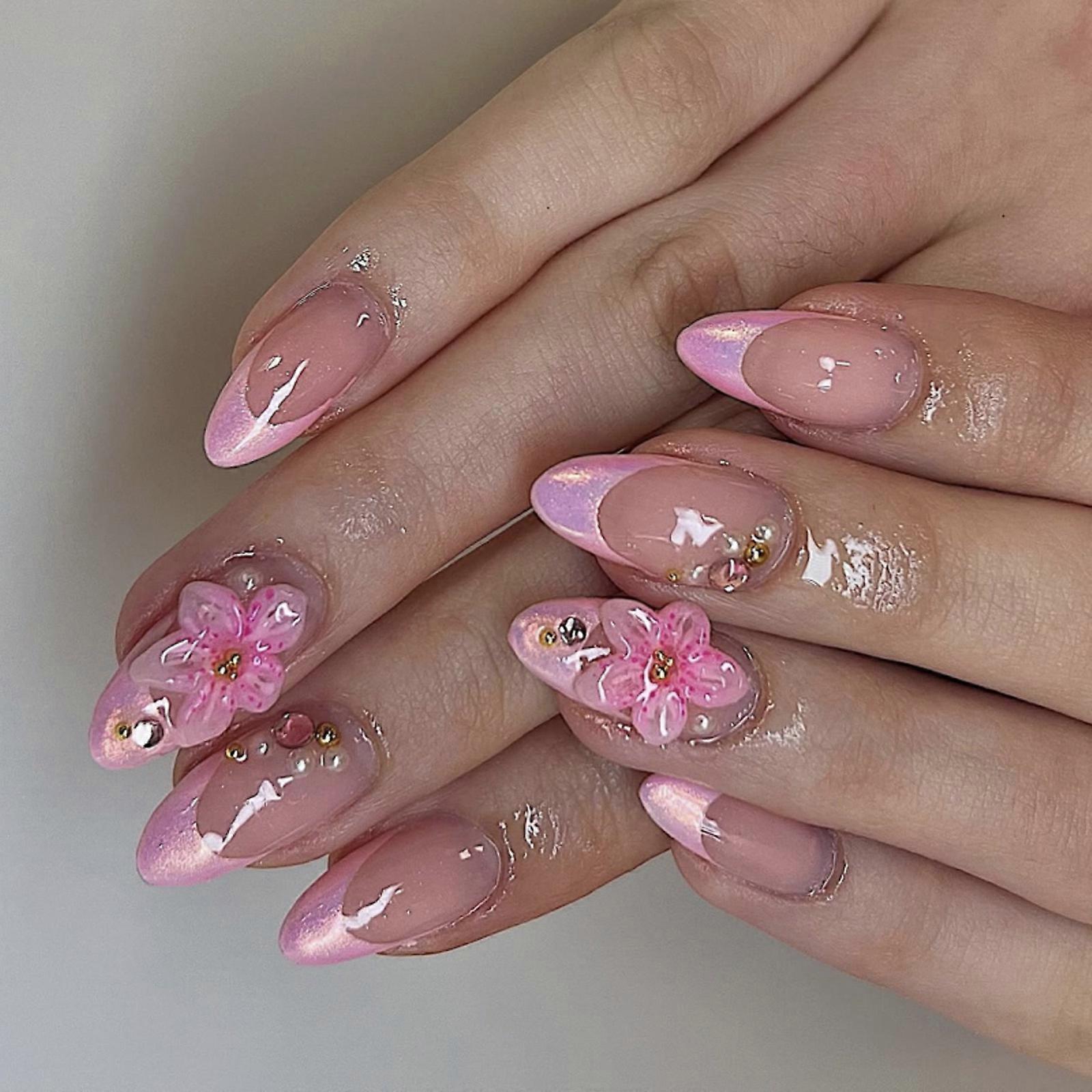French Inspired Pearlized Press On Stakes Short Almond Shape 3D Be in flower Art Glueless Application Reusable ABS Stakes Multicolor