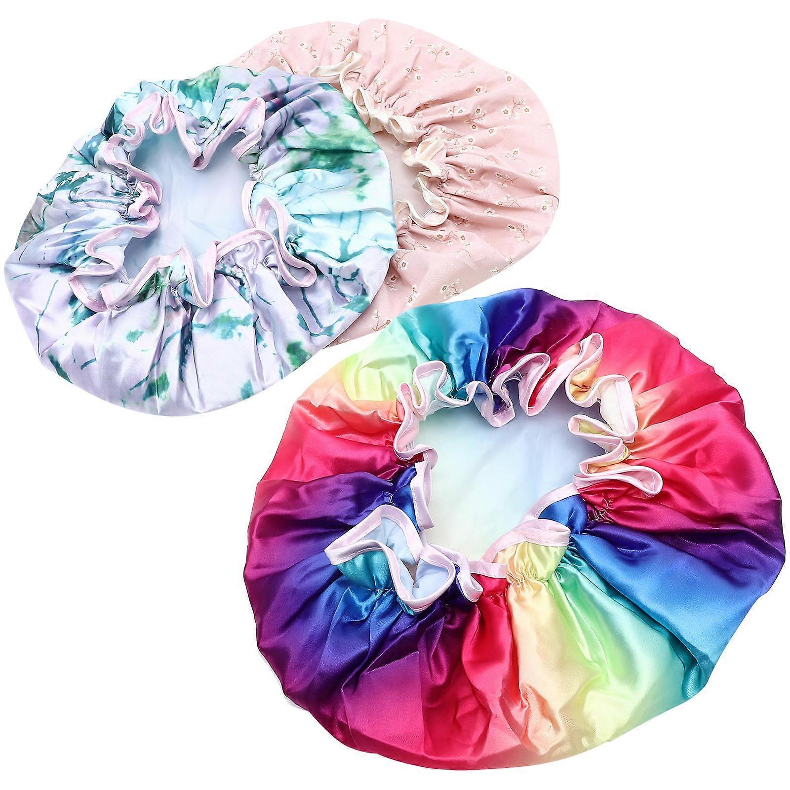 Fashionable women shower caps are great to upgrade your shower experience, effectively keep your hair from getting wet in shower. The shower caps also can be a good birthday gift choice for your friends, they will like it. Features -Color:Assorted Color -Material:Satin, PEVA -Size:28.00X28.00X1.50cm/11.00X11.00X0.59in - Contains different styles to match your personality. These shower caps are both fashionable and creative. - Shower cap keeps your hair dry during shower. Suitable for shower, household cleaning and makeup. - Lightweight and portable. These shower caps can be folded, making them easy to store and carry. - Made from satin and PEVA fabric, these shower caps are skin-friendly, and breathable, comfortable to use. - The stylish shower caps feature stretchable elastic edges to fit most head sizes, stay fresh and clean when shower. Package list: 6 x shower caps