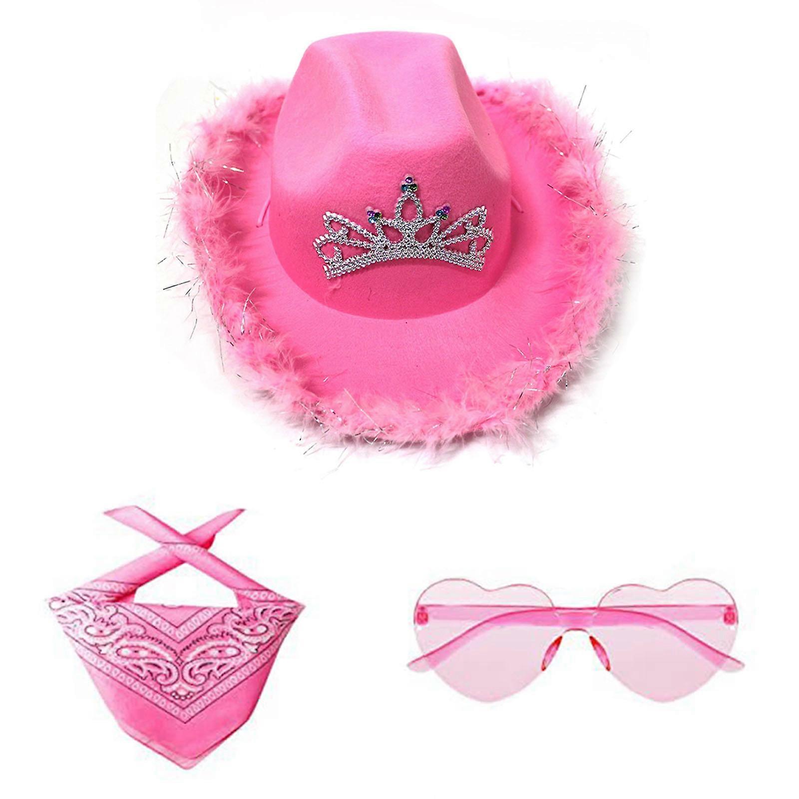 Cowboy Hat Pink | Women's Cowboy Hat Fluffy Feather Trim | Western Cowboy Hat Set, Felt Cowgirl Hat with Feather Bandana Sunglasses and Square Scarf