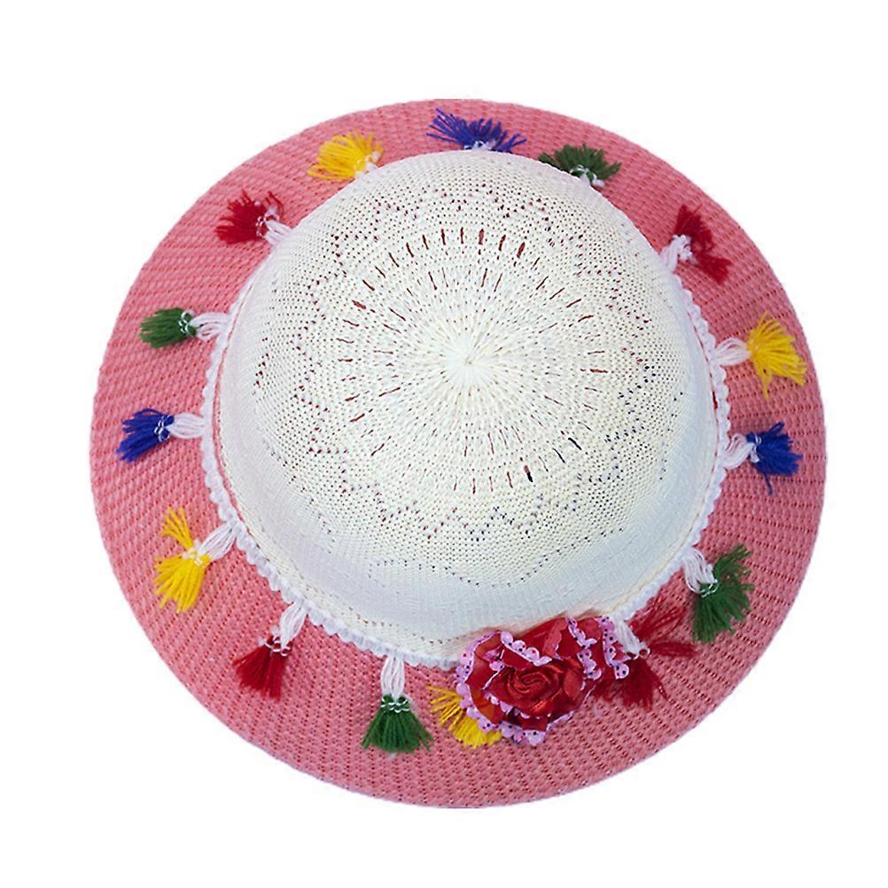 Kid Bucket Hat Straw Sun Protection Breathable Tassel Round Rosy 30CM Summer Travel 1Pack