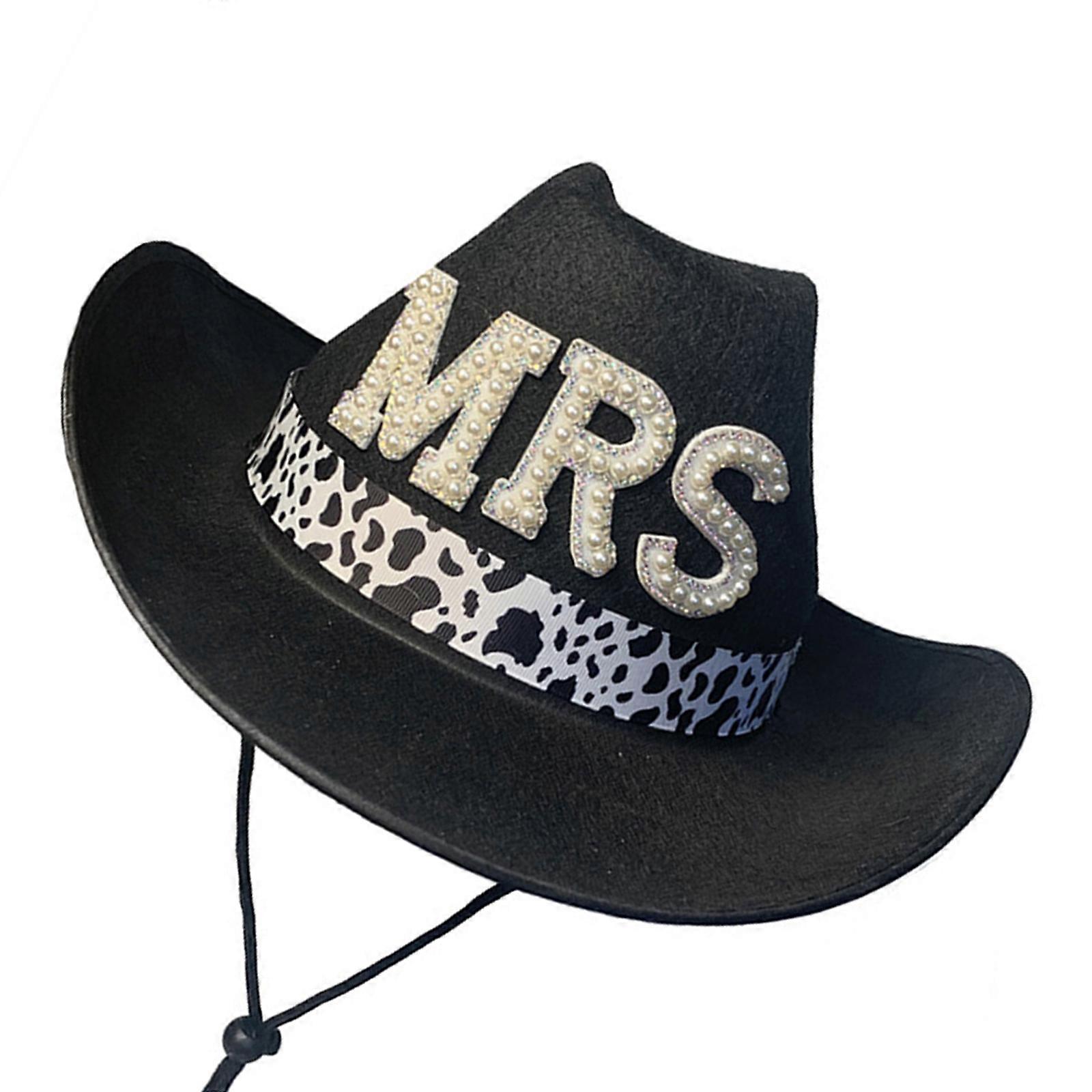Bride Hat Elegant Cowgirl Hat Encrusted Rhinestones Delicate BRIDE Banner Diamond-studded Hand Beading Hat BlackMRS