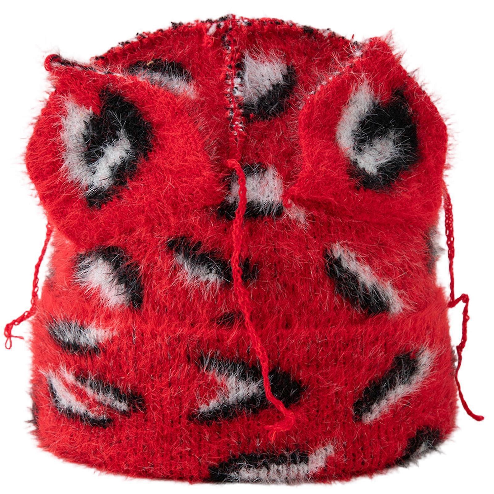Soft Leopard Pattern Acrylic Fibre Brimless Hat With Cats Ears Knitted Pullover Hat For Winter Outdoor Activity Casual Use Red