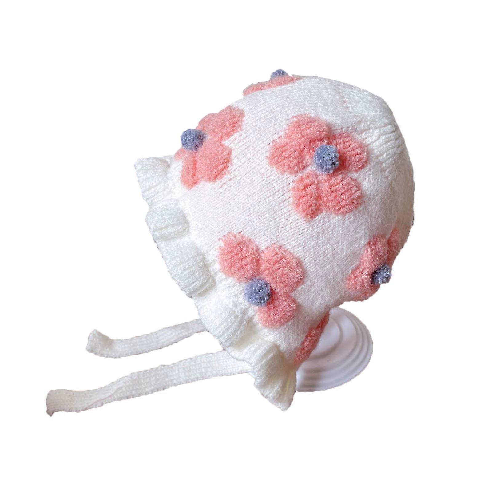 Knitted Hat for Baby Boys Girls Cartoon Flower Embroided Warm Beanies Cap Comfortable Infant Earflap Knit Warm Cap White