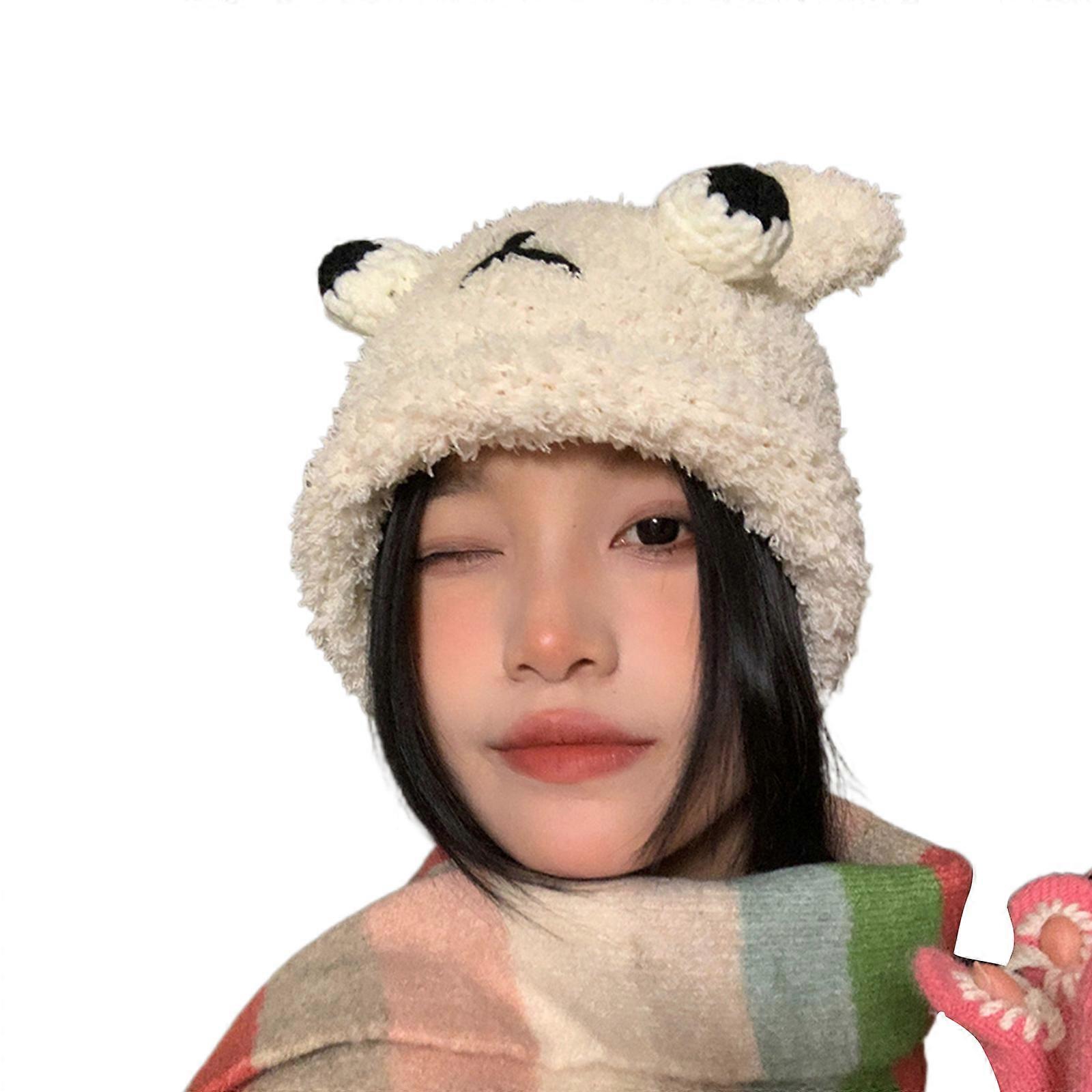 Cute Bear Design Beanie Adult Elastic Hat Winter Warmer Knitted Hat Cold Winter Presents for Students Teenagers Skiing White