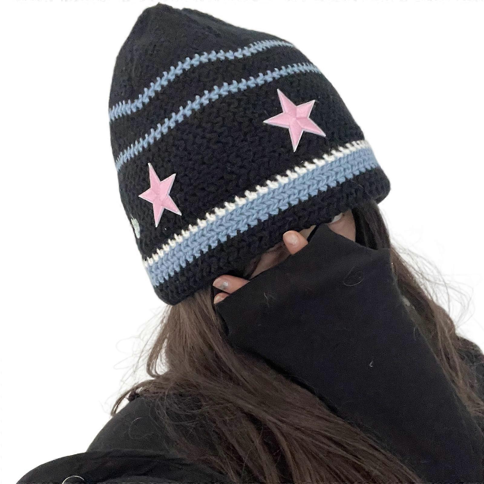 Handmade Striped Hat Y2K Sweet Girl StarPatch Bucket Hat Pilling-Resistant Autumn Winter Skull Hat Female Pullover Hat Black