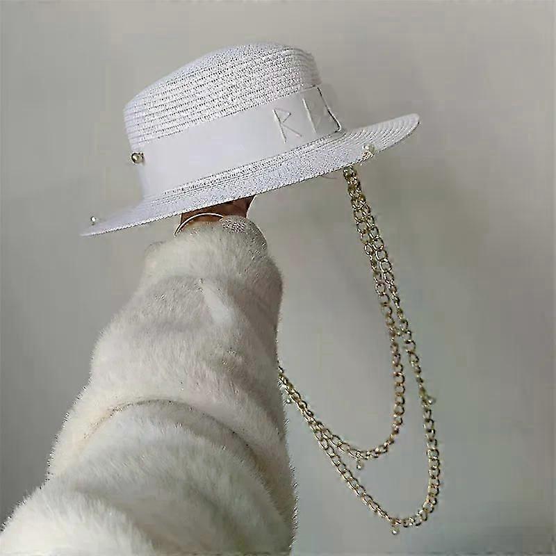 White Straw Hat Pearl Chain Flat Top Sun Hat New Korean Elastic Ribbon Hat Beach Hat Candy Color Sun Hat