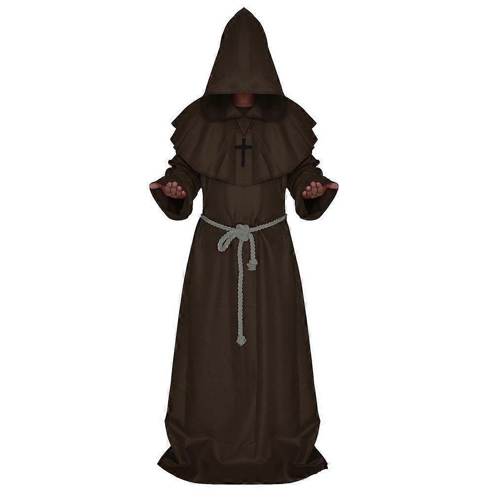 Medieval Priest Monk Robe Hooded Halloween Cosplay Costume Cloak for Wizard Sorcerer - Size XL (Coffee)