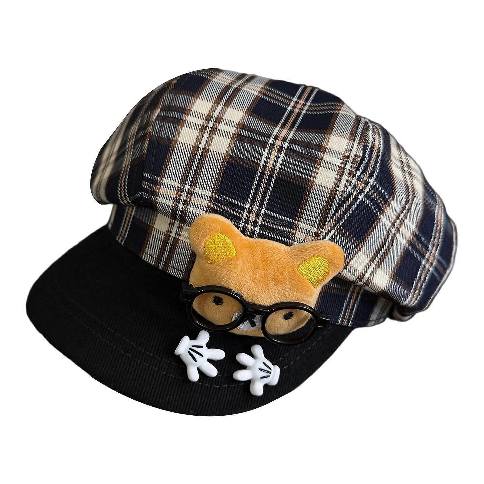 Modern Checkered Beret Embellished With Cartoon Bear Pattern Polyester Fabric Outdoor Hat Comfortable Wear Navy blue