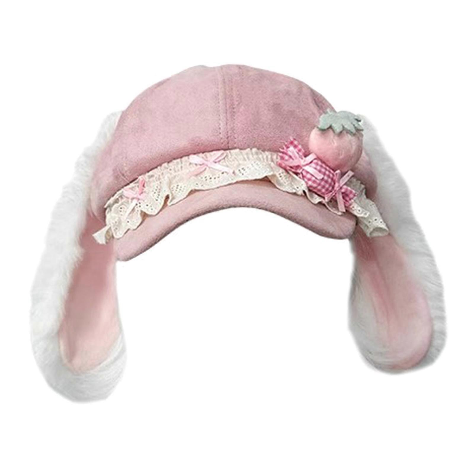 Sweet Strawberry Rabbits Ear Beret Soft Cotton Accessory Anime Anime Hat for Cosplay Event Dress Daily Casual Headwear Pink