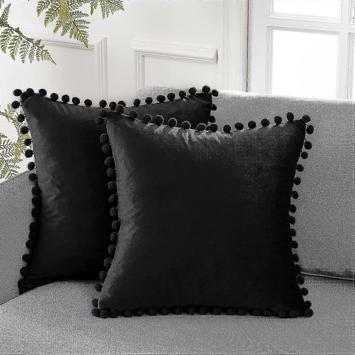 Decorative Throw Pillow Covers with Pom Poms Soft Particles Velvet Solid Cushion Covers 18 X 18 for Couch Bedroom Car, Pack of 2, Black