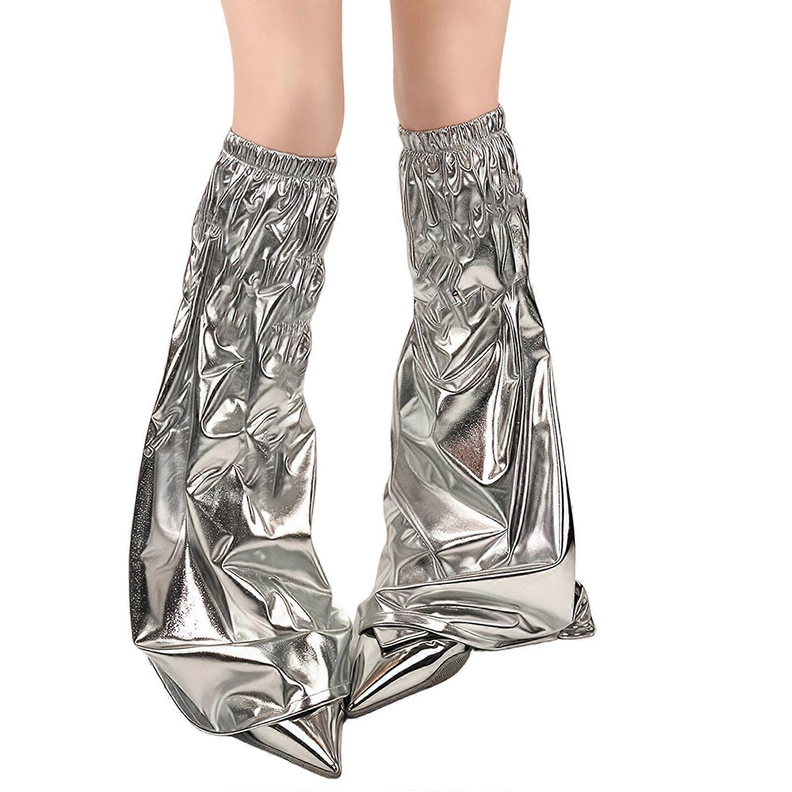 Womens Punk PU Leather Flared Leg Covers with Metallic Silver Harajuku Grunge Baggy Leg Warmers Gaiters Footless Socks Multicolor