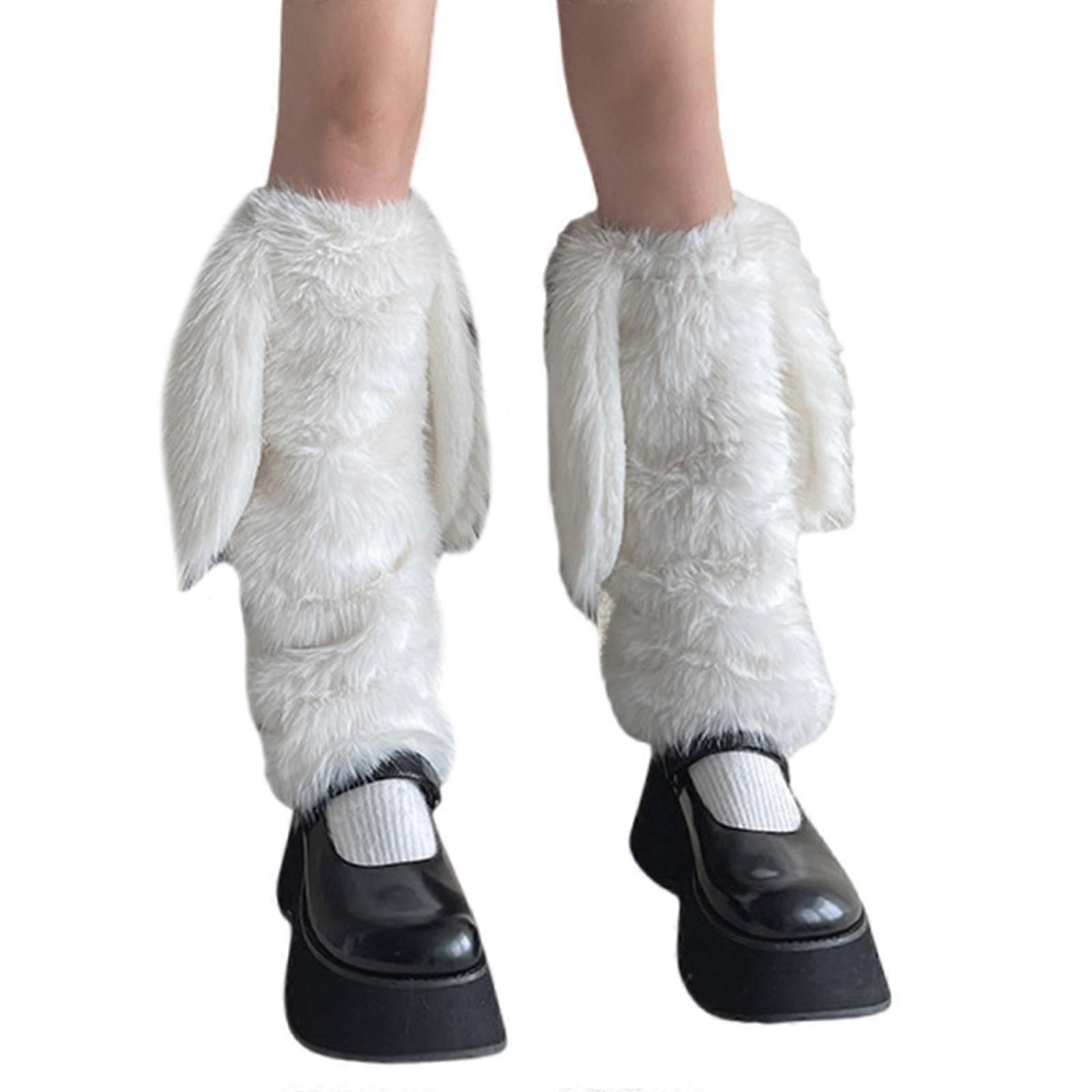 Fashionable Furry Leg Covers for Women Winter 3D Long Rabbit Ears Fuzzy Plush Leg Warmers Boot Toppers Footless Socks White