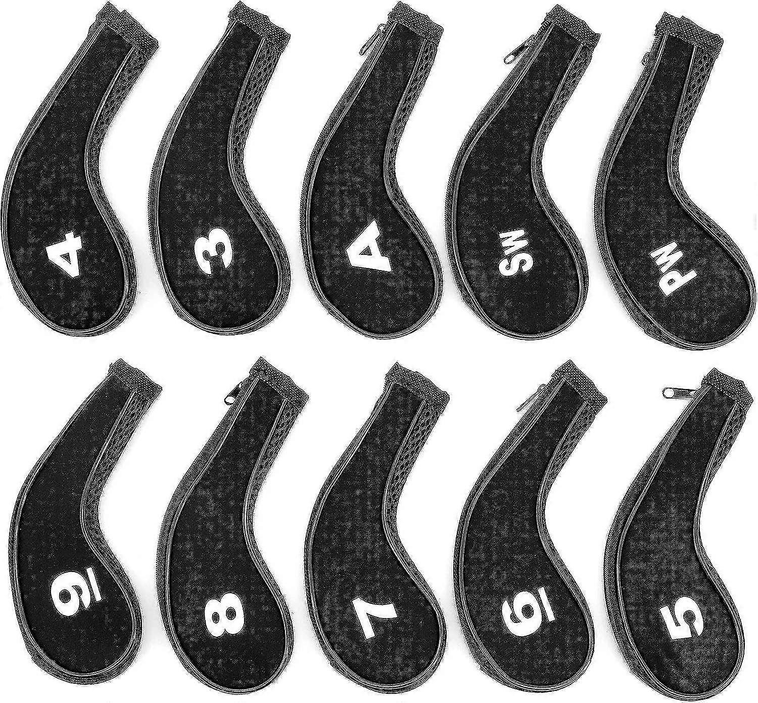 Head cover Material: Neoprene and diving equipment. It can be effectively waterproof, and it has good stretch elasticity, so there is no need to worry about being torn. The black color. The zipper of the golf club head covers prevents the club from slipping and is easy to put on and take off. These golf club head covers are thick, soft and stretchy, so they will protect your clubs from bumps and scrapes. The number print is on one side so you can easily recognize the covers -Suitable golf iron heads when playing games or traveling. Large fonts are printed on the surface of the golf club cover so you can easily find the club cover you need. The printed numbers perfectly match the surface of the golf club cover and will not fade or fade easily. Widely used golf club iron head covers: Iron covers are applied to golf clubs for almost all brands and sizes. Package included: 10 pieces golf iron head covers 3, 4, 5, 6, 7, 8, 9, PW, AW, SW. Due to factors such as manual measurement and differences in display, there may be slight differences between individual products and images, please excuse me.