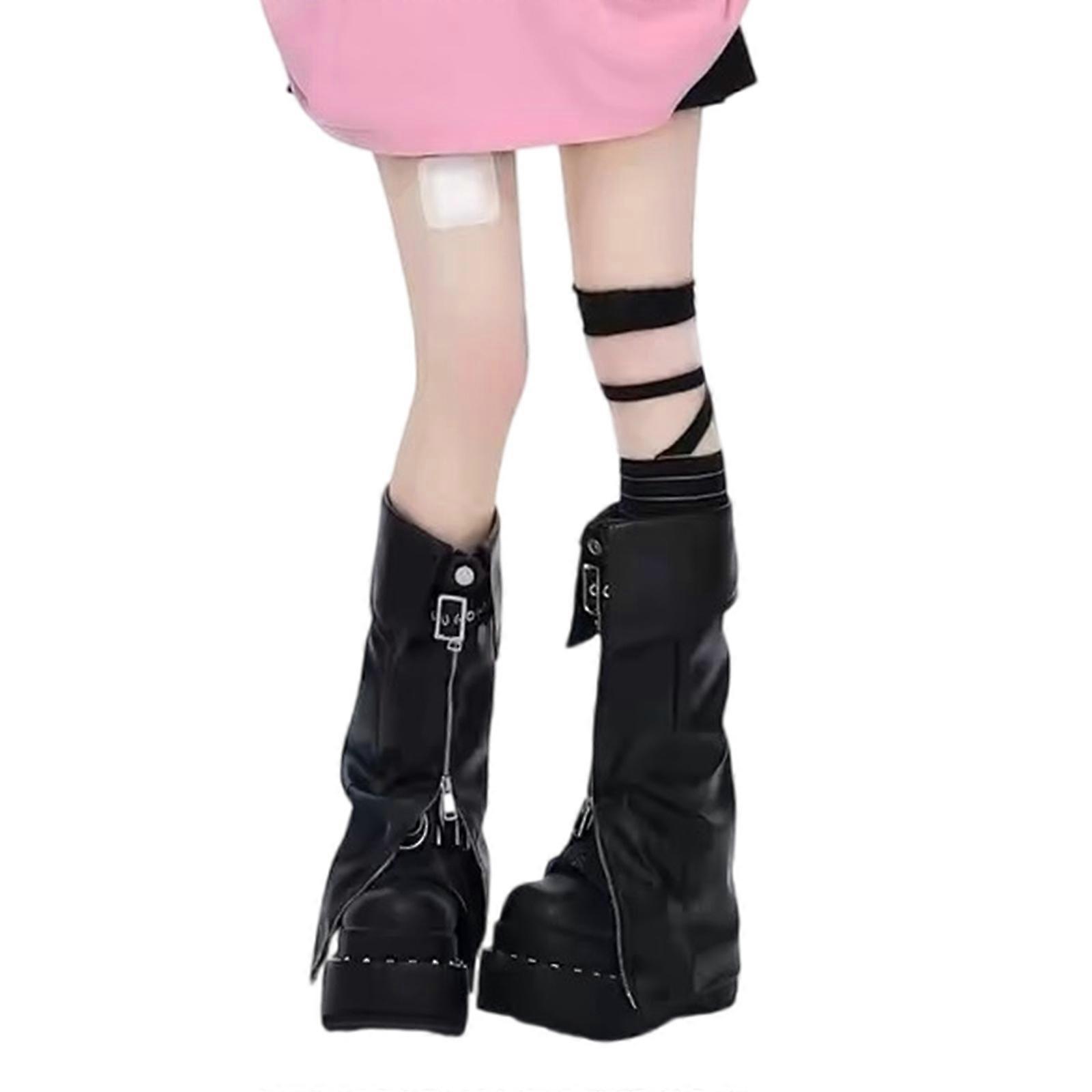 Women Black Leg Gaiters Cover with Buckled and Zippered Harajuku Girl Punk PU Leather Leg Warmer Flared Socks Streetwear Black