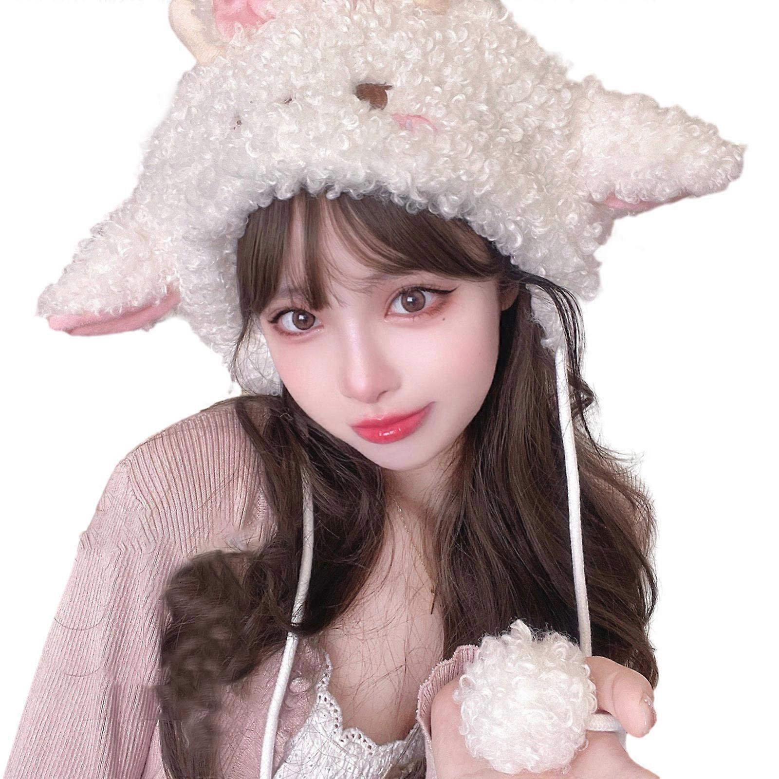 Furry Lamb Girls Headgear Lovely Headdress Winter Beanie Hat for Halloween Cosplay Headgear for Kids Stage Shows White