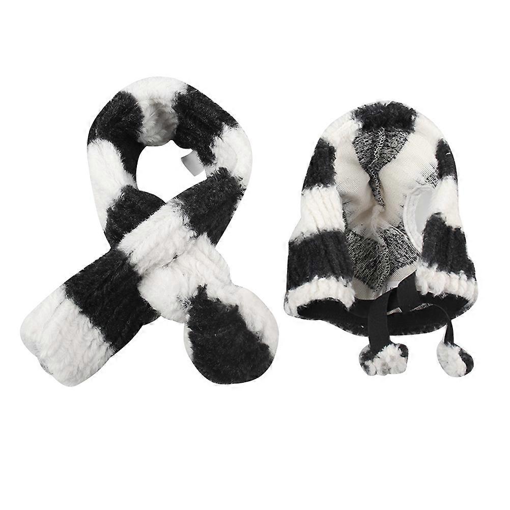 Dog Cat Warm Stripe Scarf Hat Set Pet Winter Costume Prevent Illness White Black 1Set