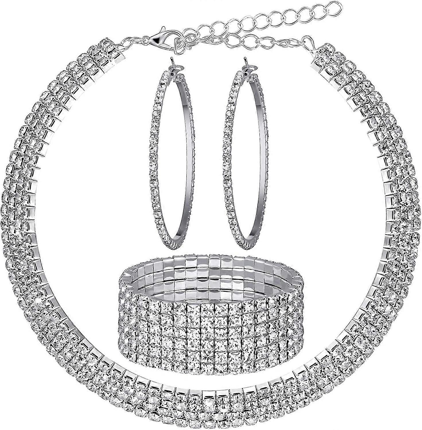 Bridal Crystal Rhinestone Jewelry Set Necklace Bracelet Hoop Earrings For Wedding Party (d-4)