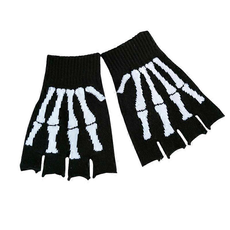 Skull Pattern Knit Gloves Half Finger Cut Soft Cold Weather Accessory For Halloween Celebrations Camping And Commuting Black