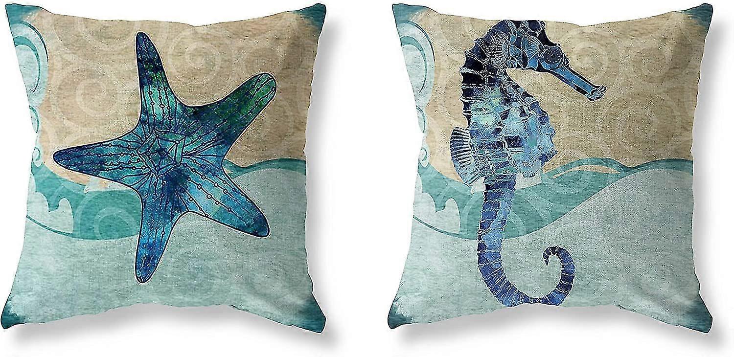 Throw Pillow Covers 18x18 Inch Set Of 2 - Cotton Linen Blue Ocean Theme Starfish Seahorse Beach Game Pillow Covers, Decorative Pillowcase For Home Sof