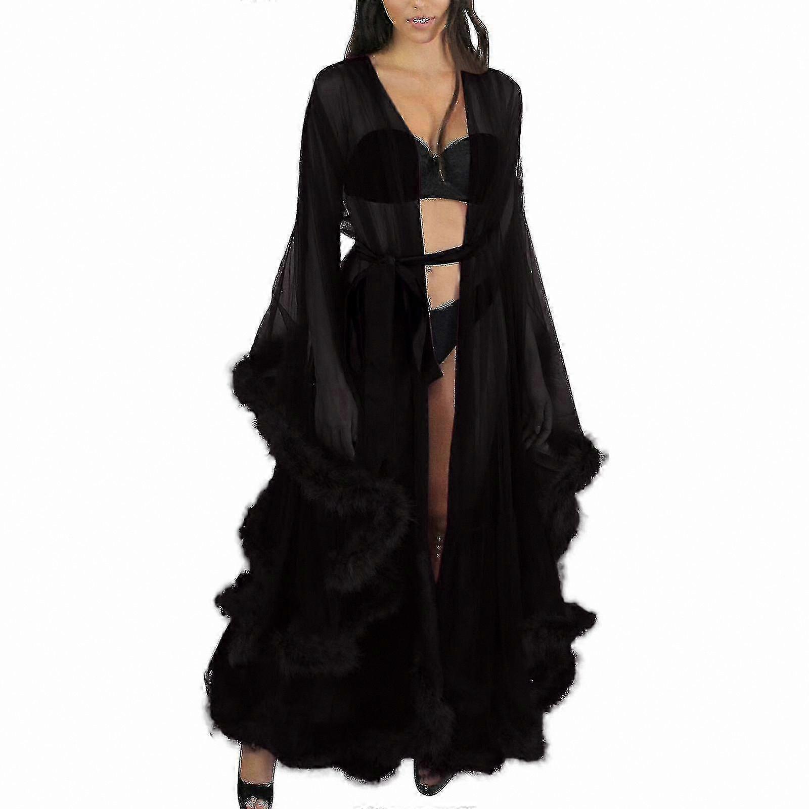 Women's Elegant Tulle Nightgown Long Sleepwear Bathrobe Lace Trim Bridal Robe Feather Accent Lingerie 가운
