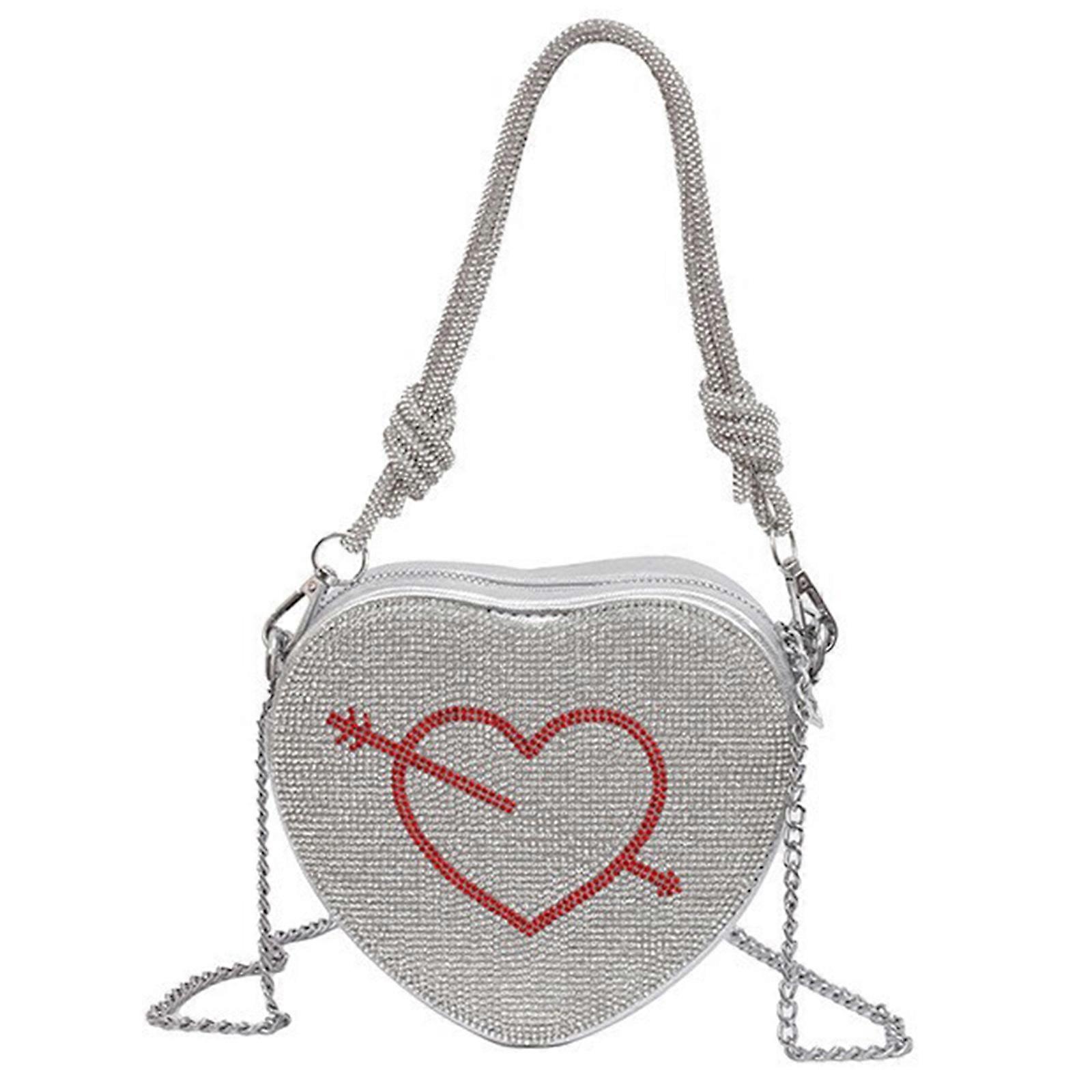 Heart Shaped Evening Bag Chain Strap Shoulder Bag Trend Handbag Purse Rhinestones Evening Bag for Women and Girls Silver