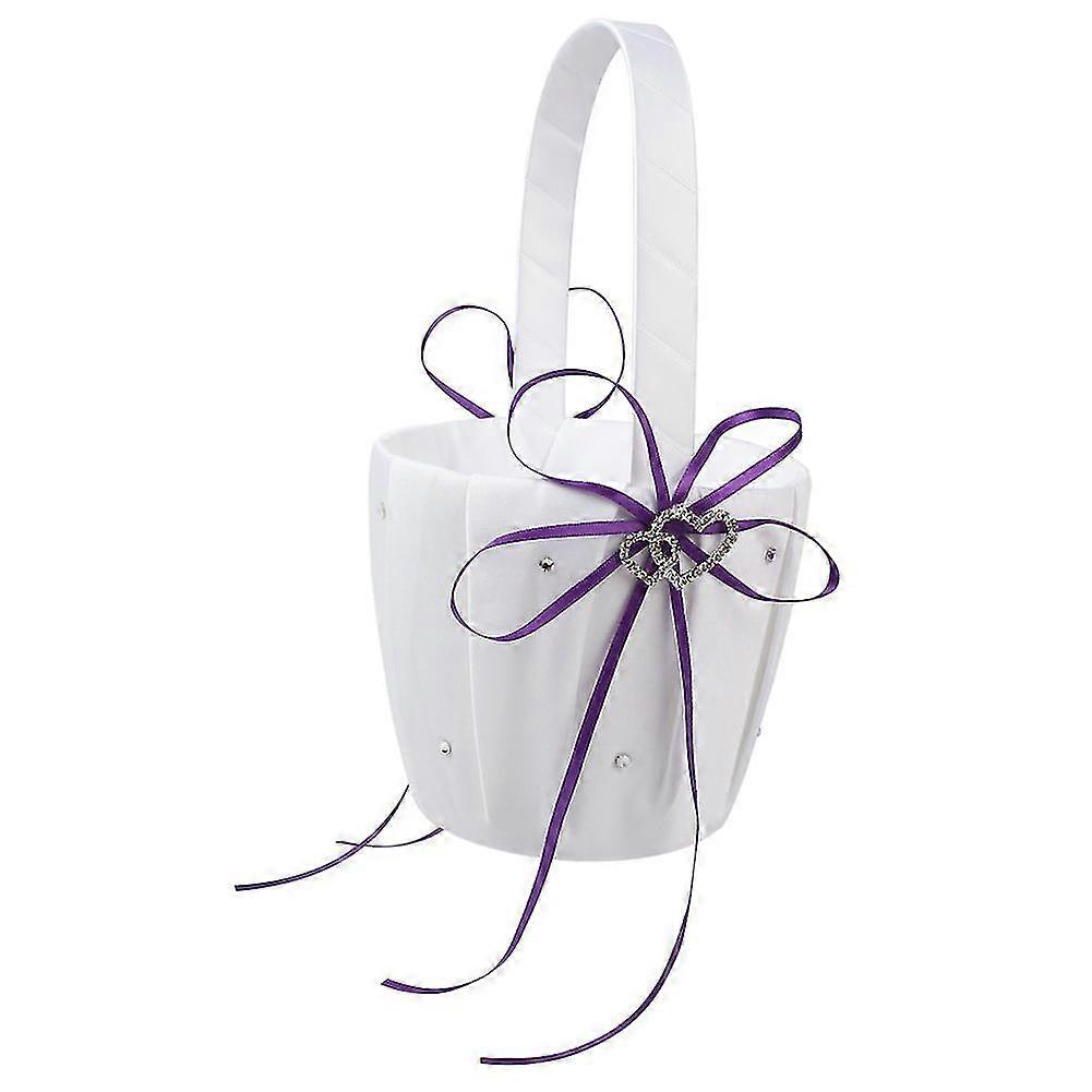 Double Heart Wedding Flower Girl Basket White Satin Rhinestone Decor Purple Wedding Party Favor