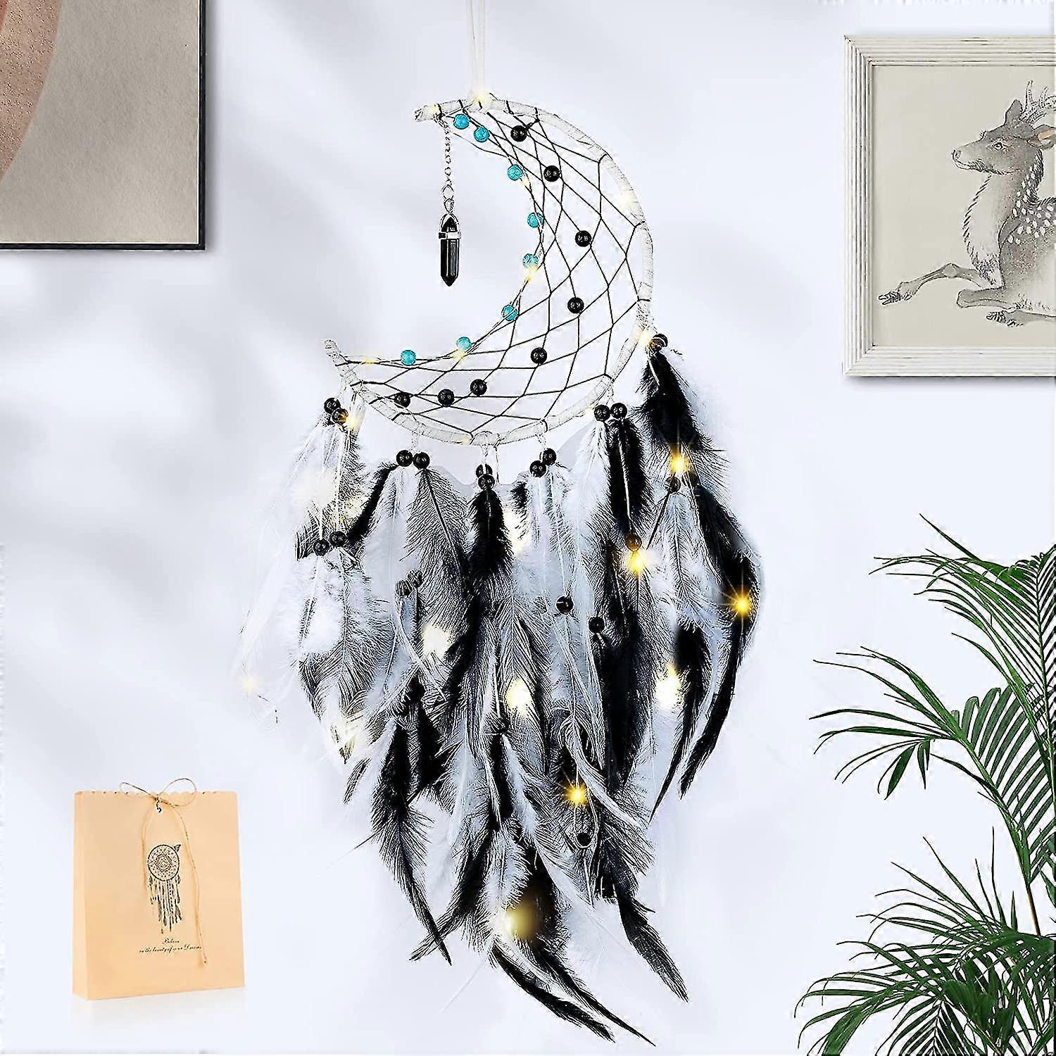 Led Moon Dream Catcher With Crystal Feather Wall Hanging Decor For Bedroom Lucky Turquoise Purple Craft