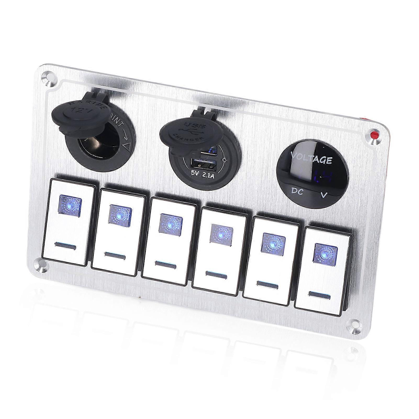 Rocker Switch Panel 6 Gang On Off Blue LED Light 2.1A Dual USB Charger Port Aluminum Alloy for Car RV