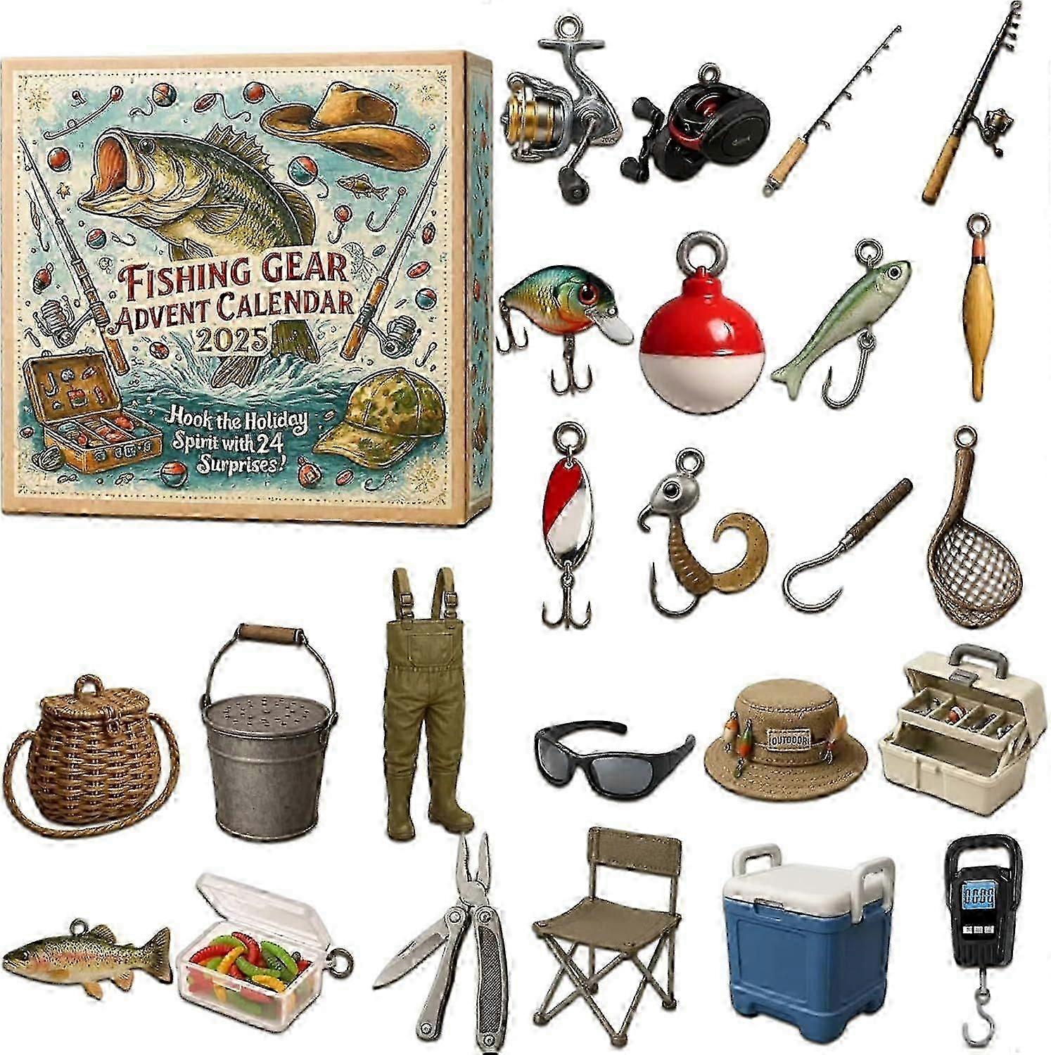Quality Fishing Gear Advent Calendar 2025, Christmas Countdown Calendar with 24pcs Mini 2d Acrylic Fishing Tackle & Accessories Ornaments, Unique Xmas