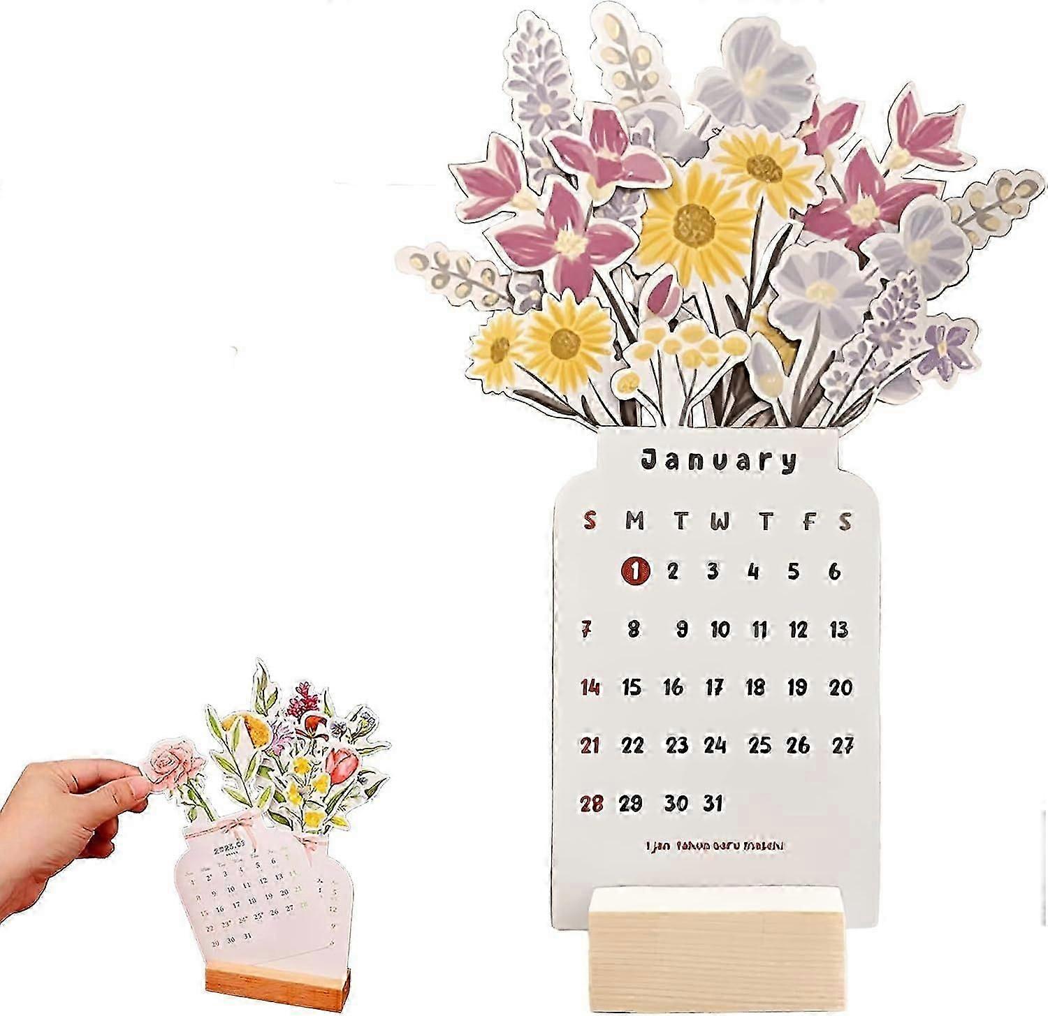 Bloomy Flowers Desk Calendar, Wooden Base & 12 Vase Shaped Paper Monthly Planner, Creative Desk Calendar, Desk Decoration Christmas Gifts (B)