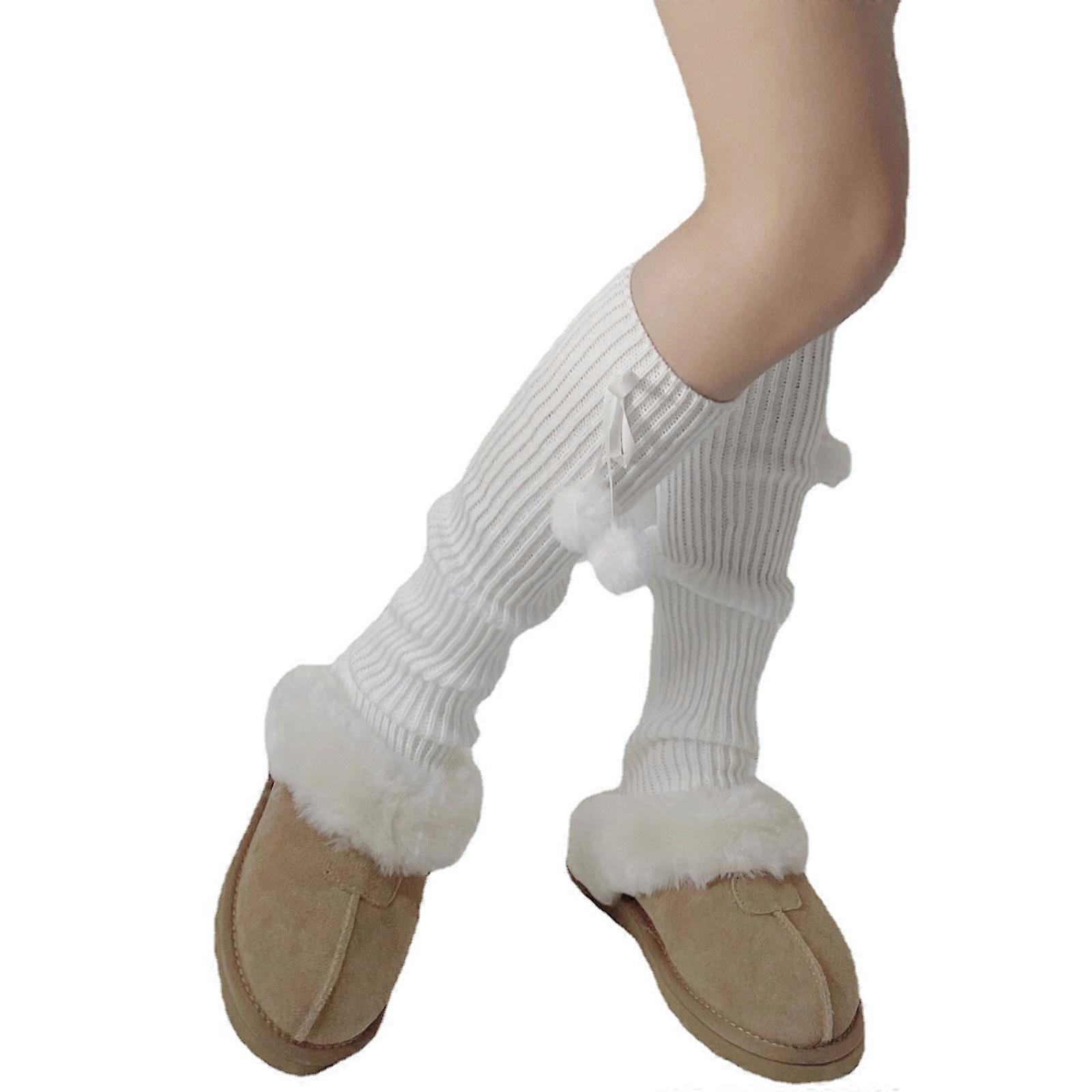 Lolita Ribbed Knit Leg Warmers Women Kawaii Plush Hair Ball Lace-Up Bowknot Foot Cover Solid Color Warm Knee High Socks Cream white