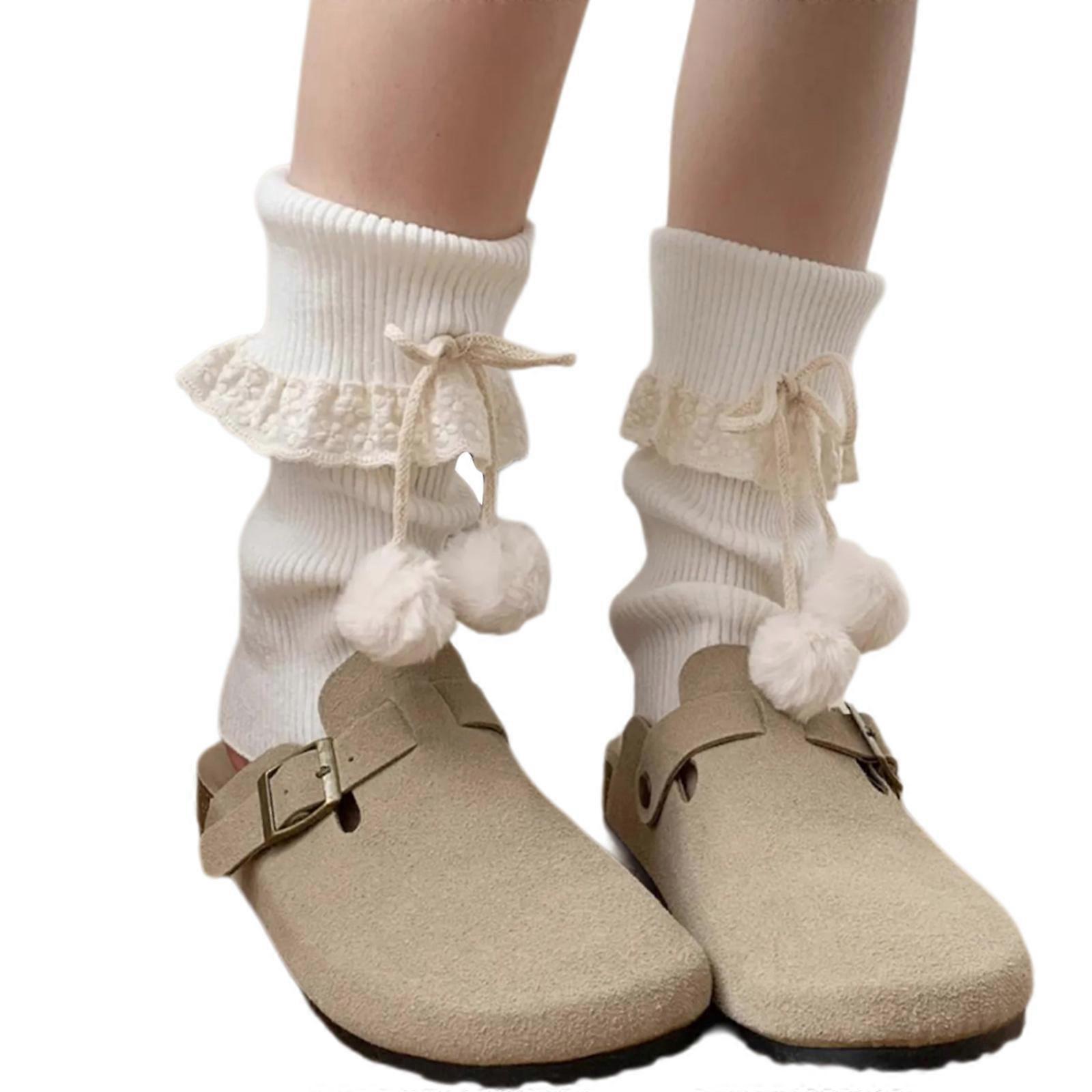 Womens Lolitas Knit Long Socks Bows Lace Up Leg Warmers Harajuku Lace Frilly Booties Socks Winter Warm Ankle Heap Socks Milky white