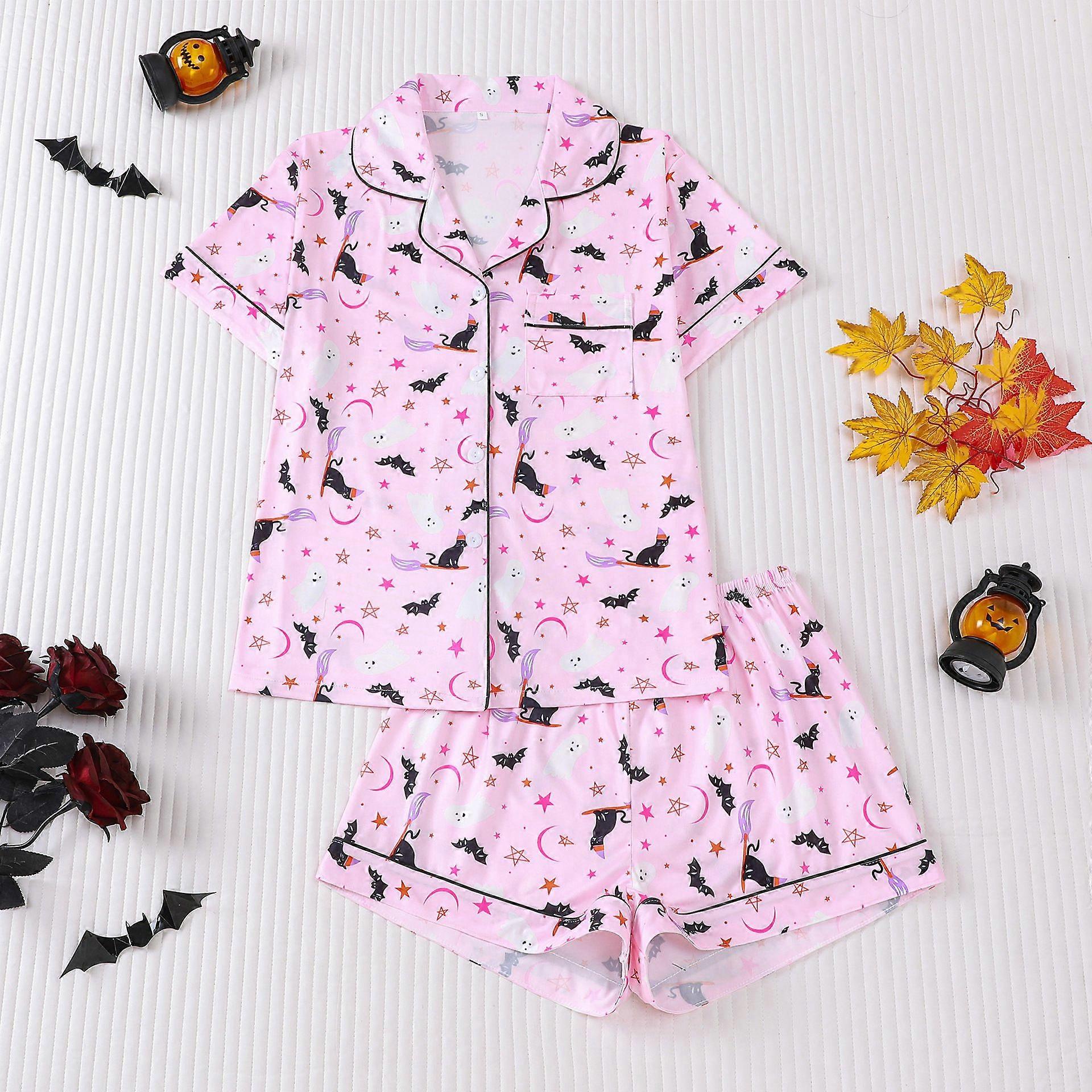 Halloween Print Milk Silk Pajama Set Women Summer Thin Short Sleeve Shorts Homewear