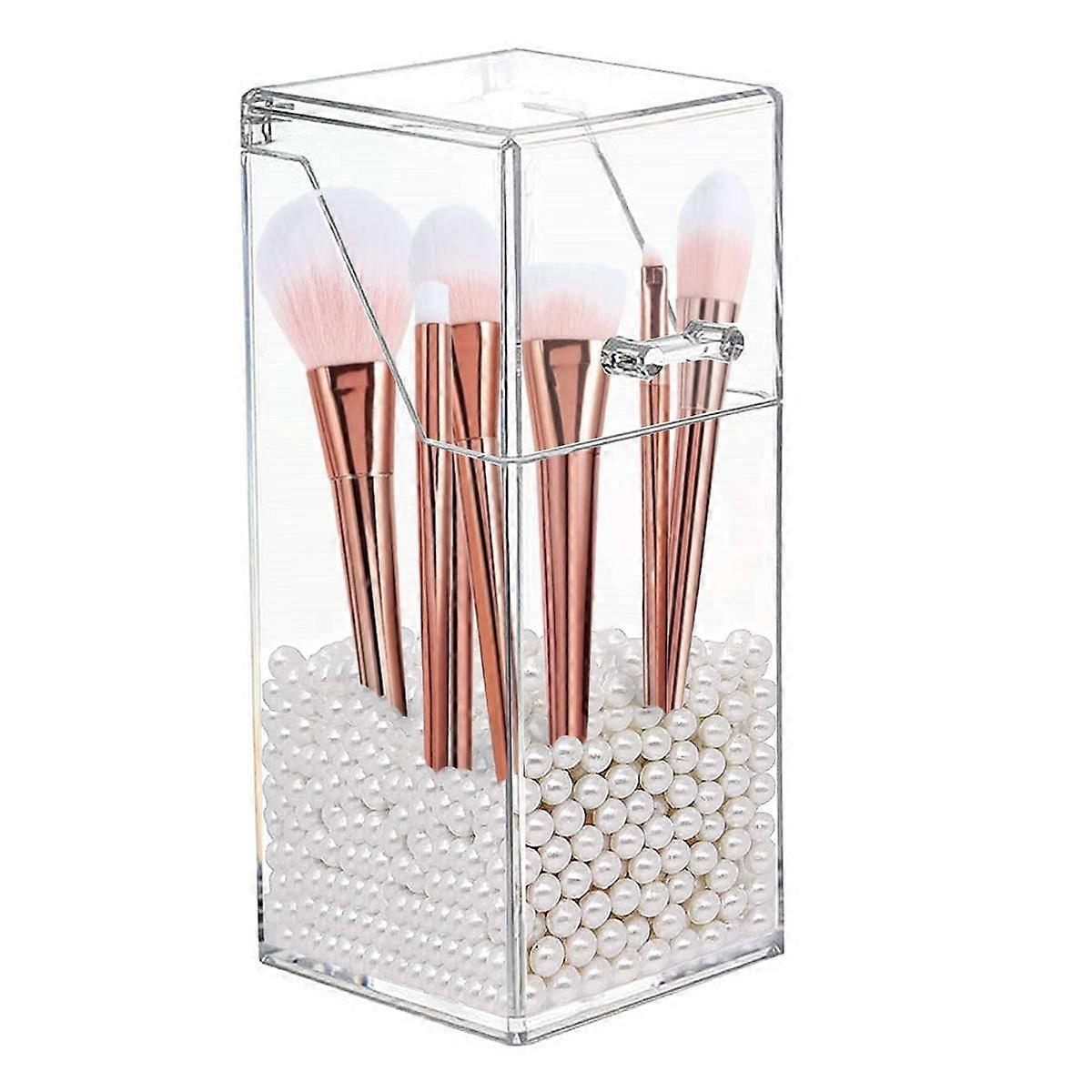 Makeup Brush Holder Organizer with Lid and Pearl, Clear Square